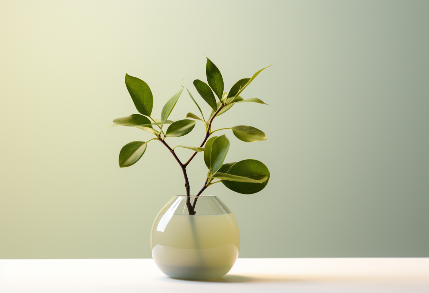 Minimalist green plant in a round glass vase on a white surface with a soft green background, creating a serene and fresh aesthetic.