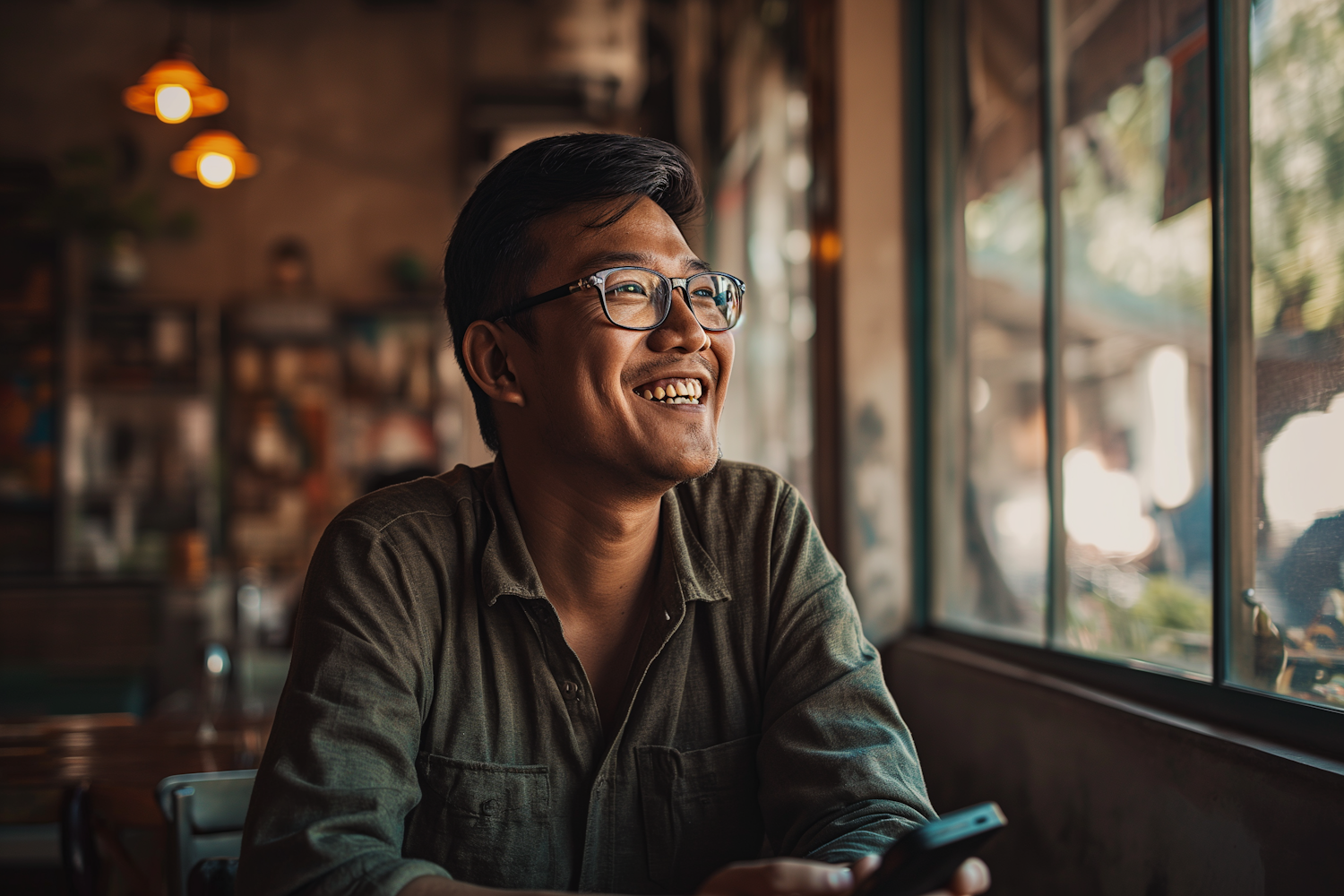 Asian man with glasses smiling by a window, holding a phone in a cozy cafe with warm lighting.
