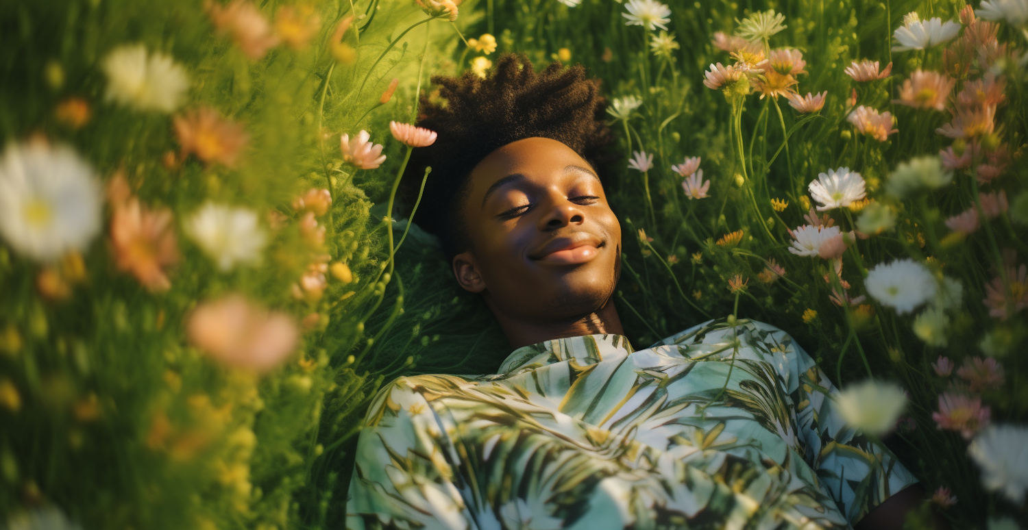 A young man relaxes in a vibrant field of wildflowers, wearing a tropical shirt, surrounded by sunlight and colorful blooms.