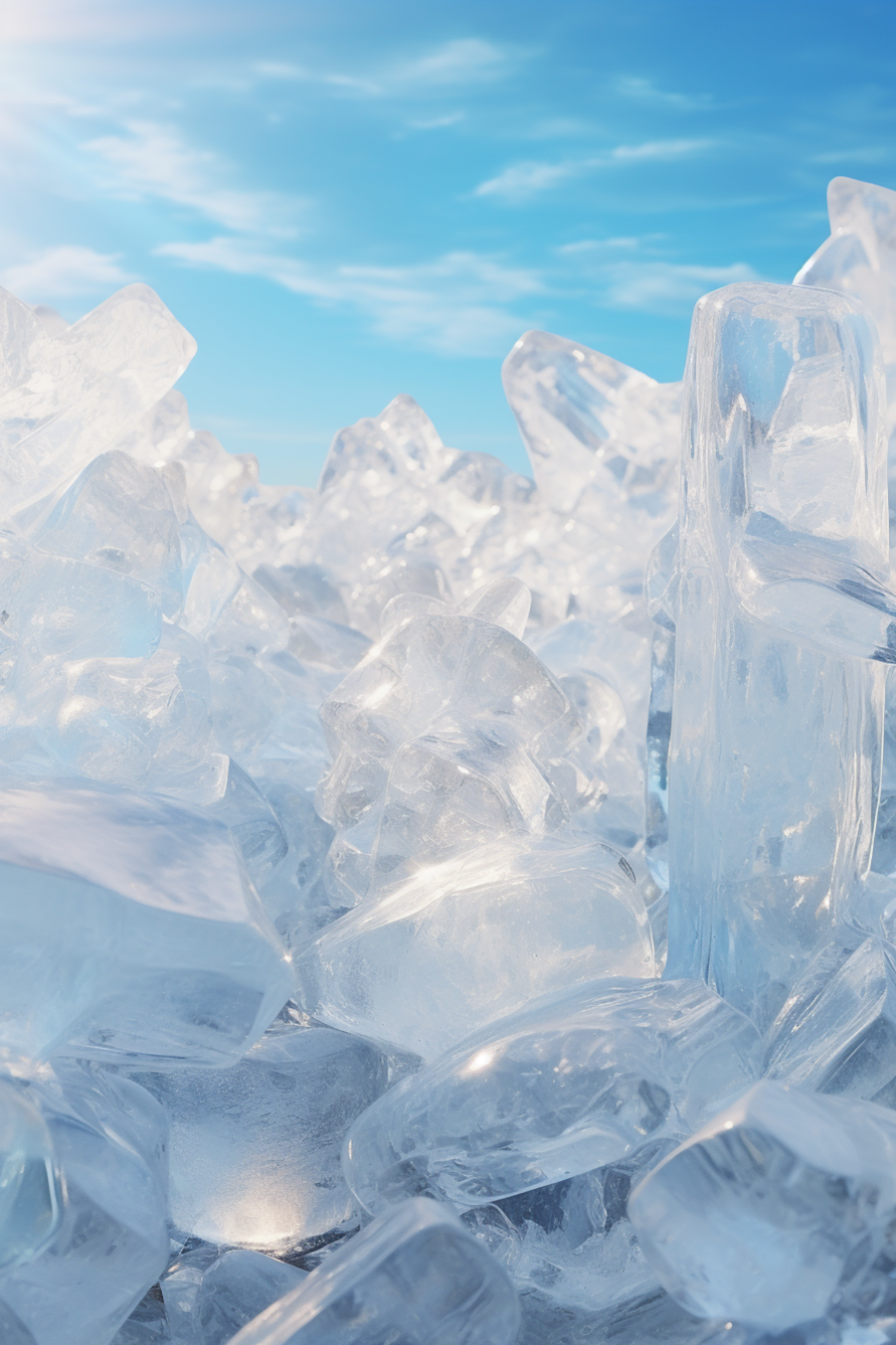 Glistening ice cubes under a bright blue sky, capturing sunlight and creating a sparkling, fresh scene.