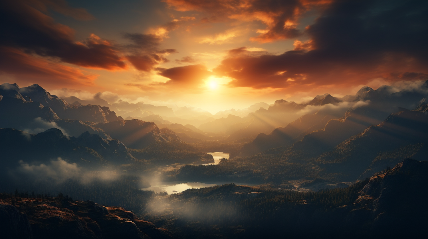 Stunning sunset over a majestic mountain range with misty valleys and a serene lake, creating a tranquil and awe-inspiring scene.