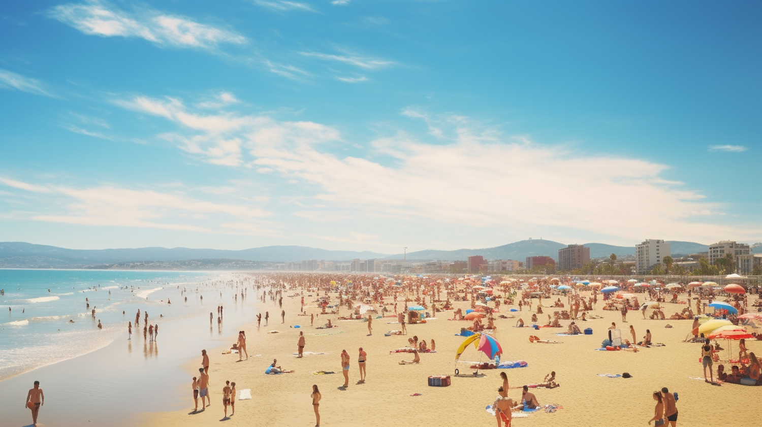 Crowded beach with colorful umbrellas, people enjoying the sun, and a cityscape in the background under a clear blue sky.