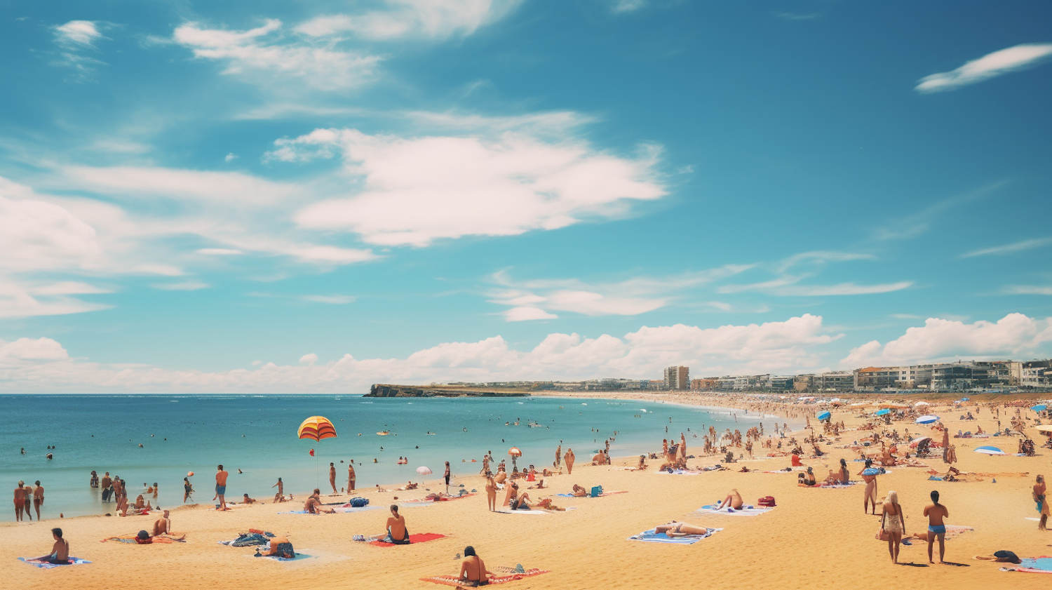 Sunny beach scene with people sunbathing, swimming, and parasailing. Vibrant colors and a lively atmosphere.