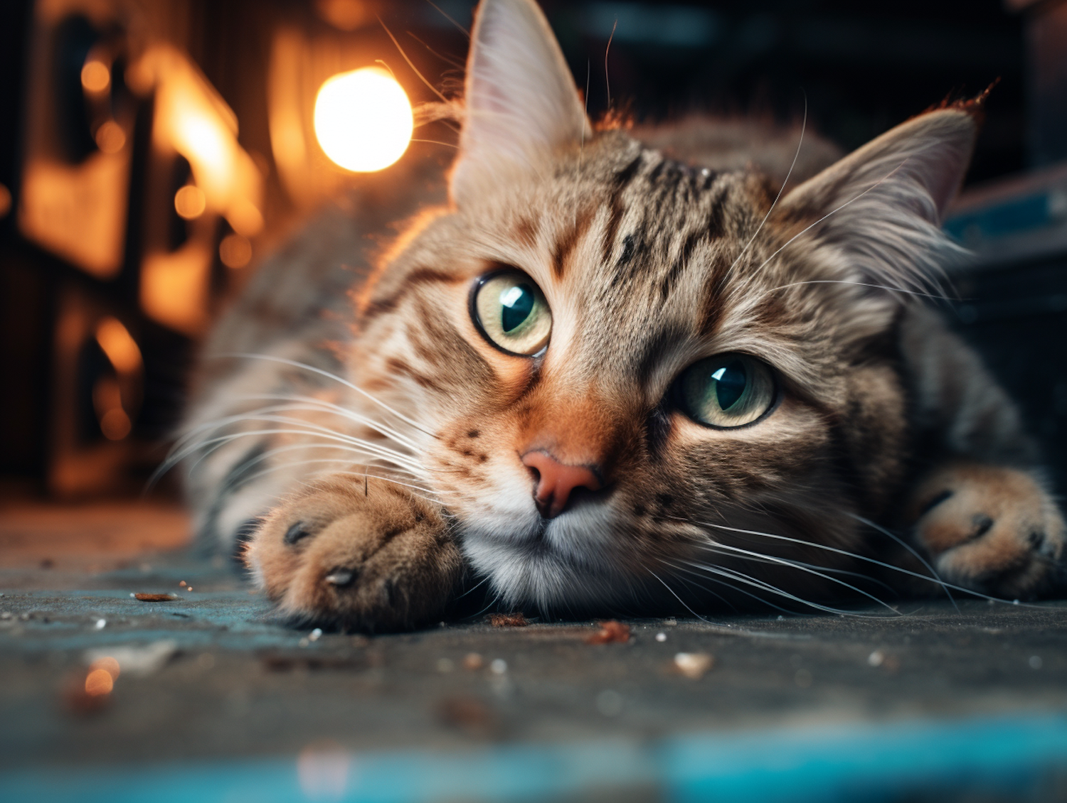 Close-up of a tabby cat with green eyes lying down, warm lighting and blurred background create a cozy and serene atmosphere.