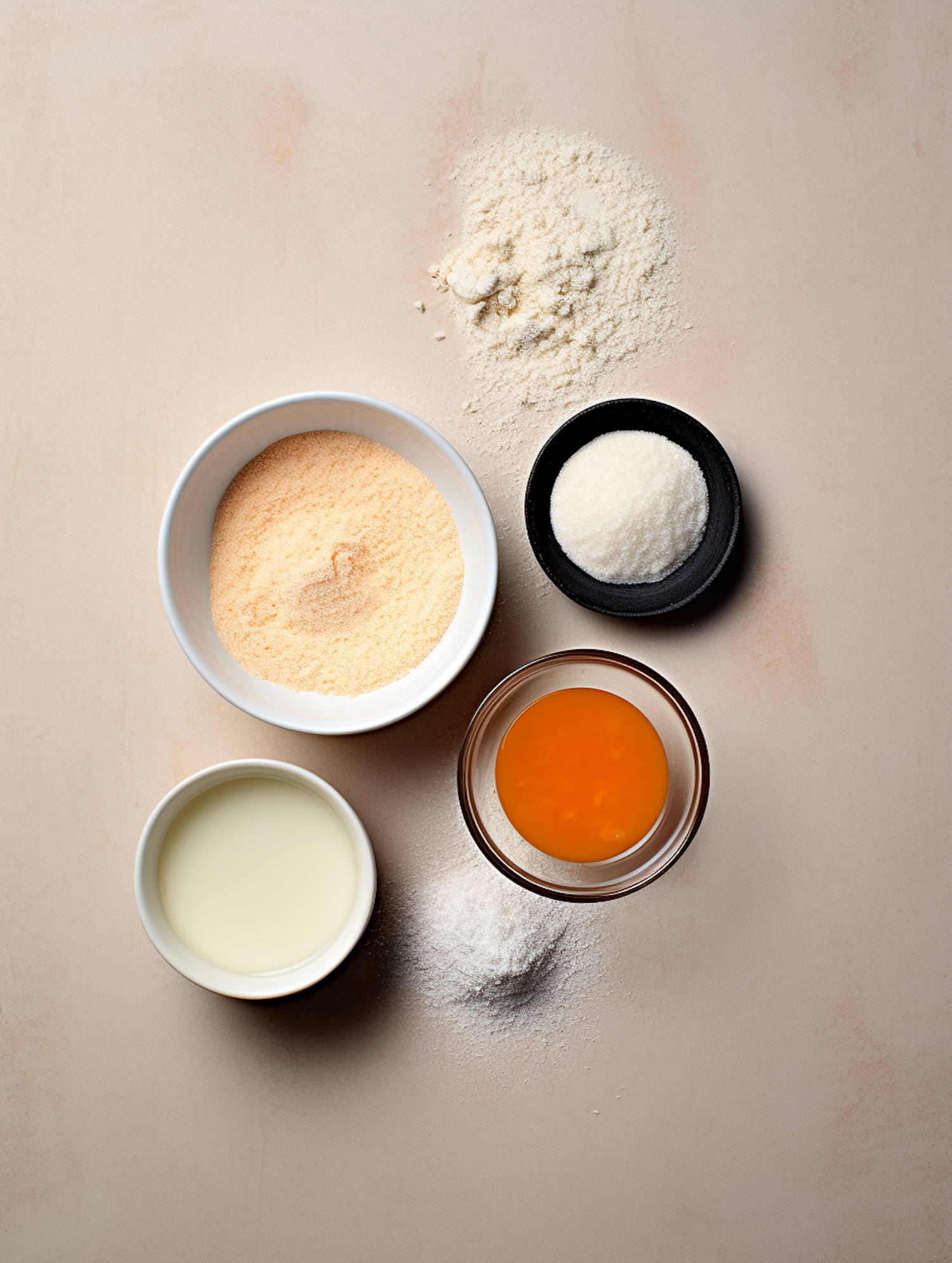 Baking ingredients arranged on a beige surface: flour, sugar, egg yolk, milk, and breadcrumbs in bowls and piles.