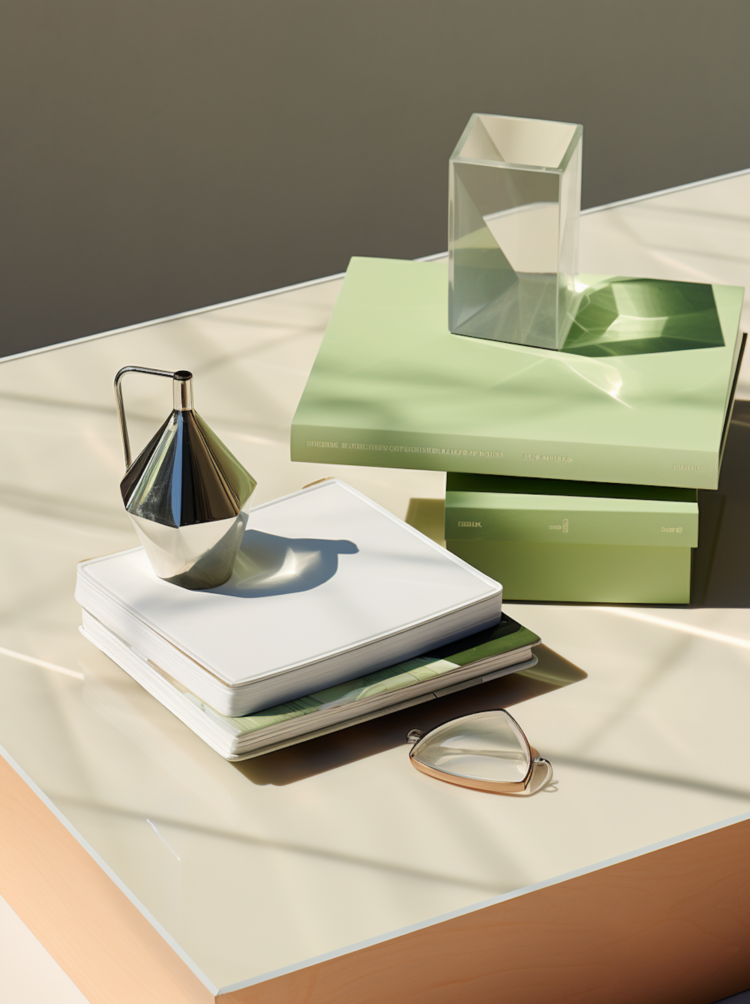 Minimalist still life with a metallic pitcher, books, and a prism on a glossy surface. Soft green and cream tones create a serene vibe.