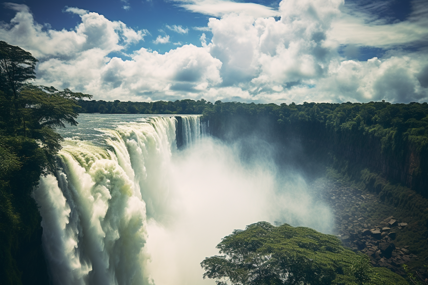 Majestic waterfall with lush greenery and misty spray under a cloudy blue sky, creating a serene and powerful natural scene.