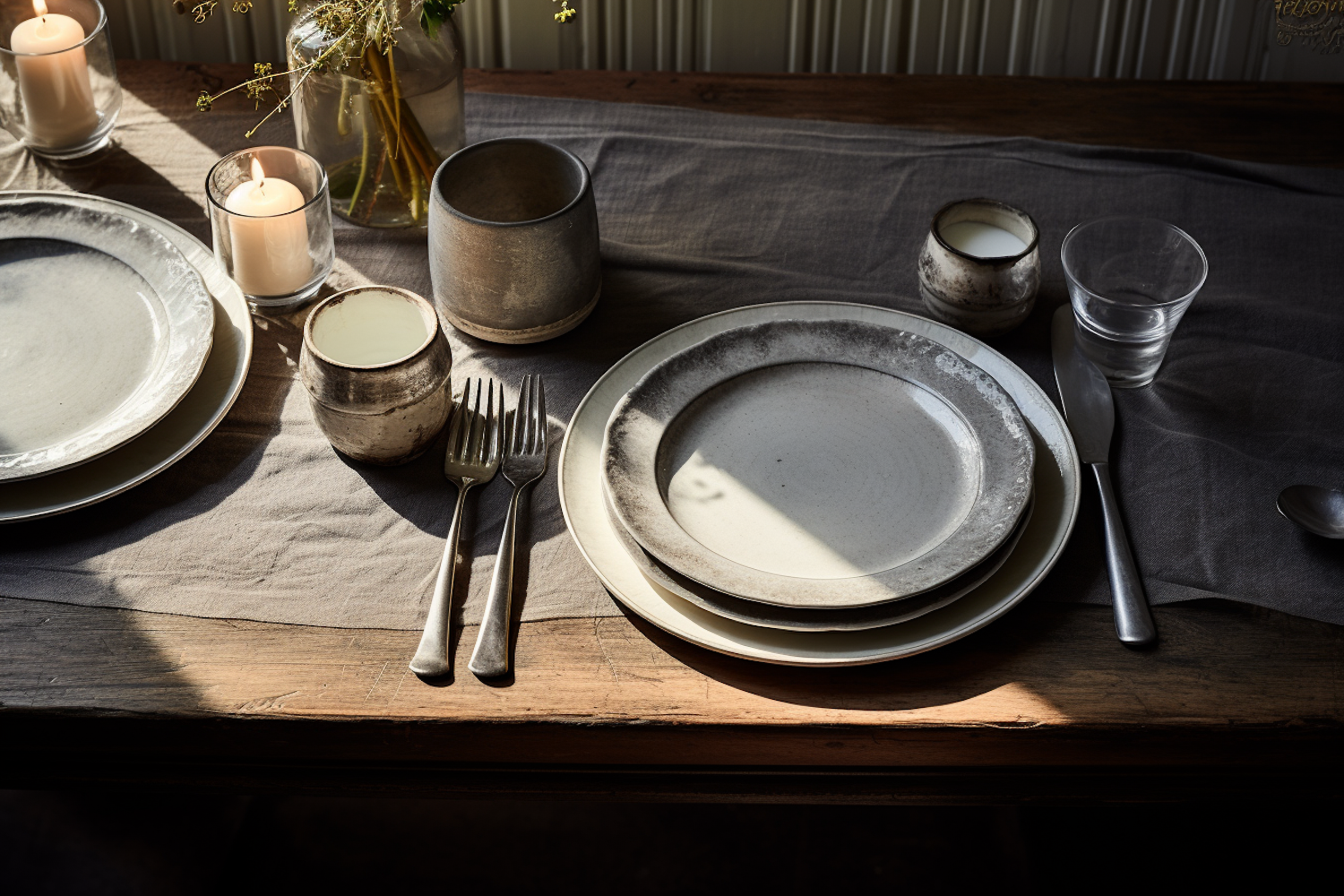 Rustic dining table with ceramic plates, cutlery, candles, and dried flowers on a gray linen cloth, bathed in warm sunlight.