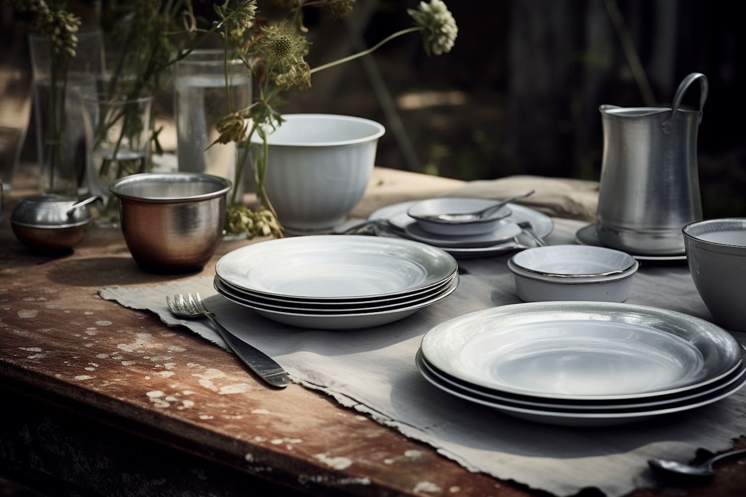Rustic outdoor dining setup with white plates, metallic accents, wildflowers, and soft natural lighting on a weathered wooden table.