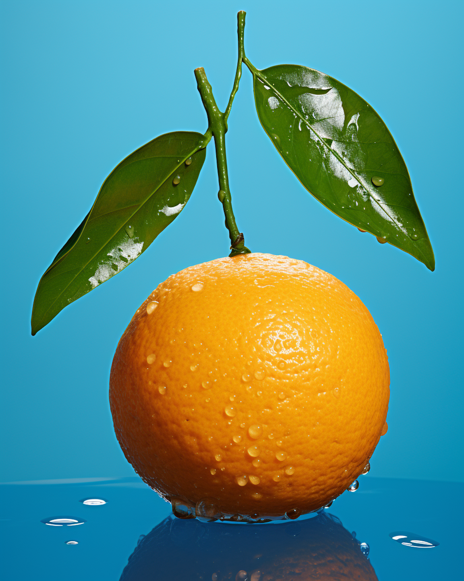 Fresh orange with water droplets and green leaves against a bright blue background, highlighting its vibrant and juicy appearance.