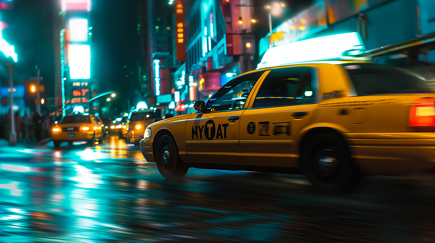 Yellow taxi speeding through a neon-lit city street at night, with reflections on wet pavement creating a vibrant urban scene.