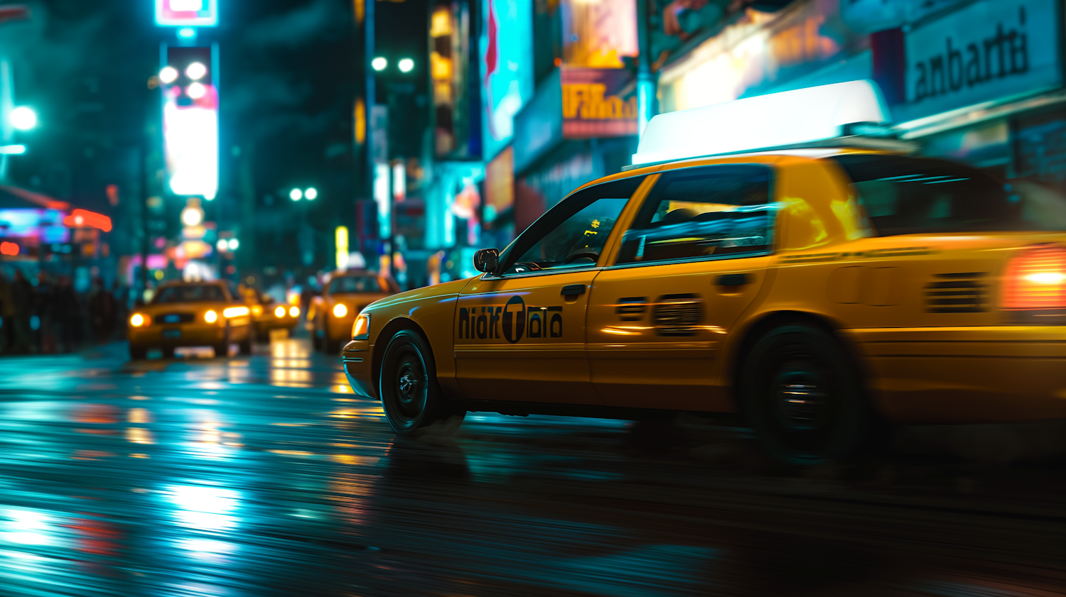 Dynamic night city scene with yellow taxis and vibrant neon lights reflecting on wet streets, capturing urban energy.