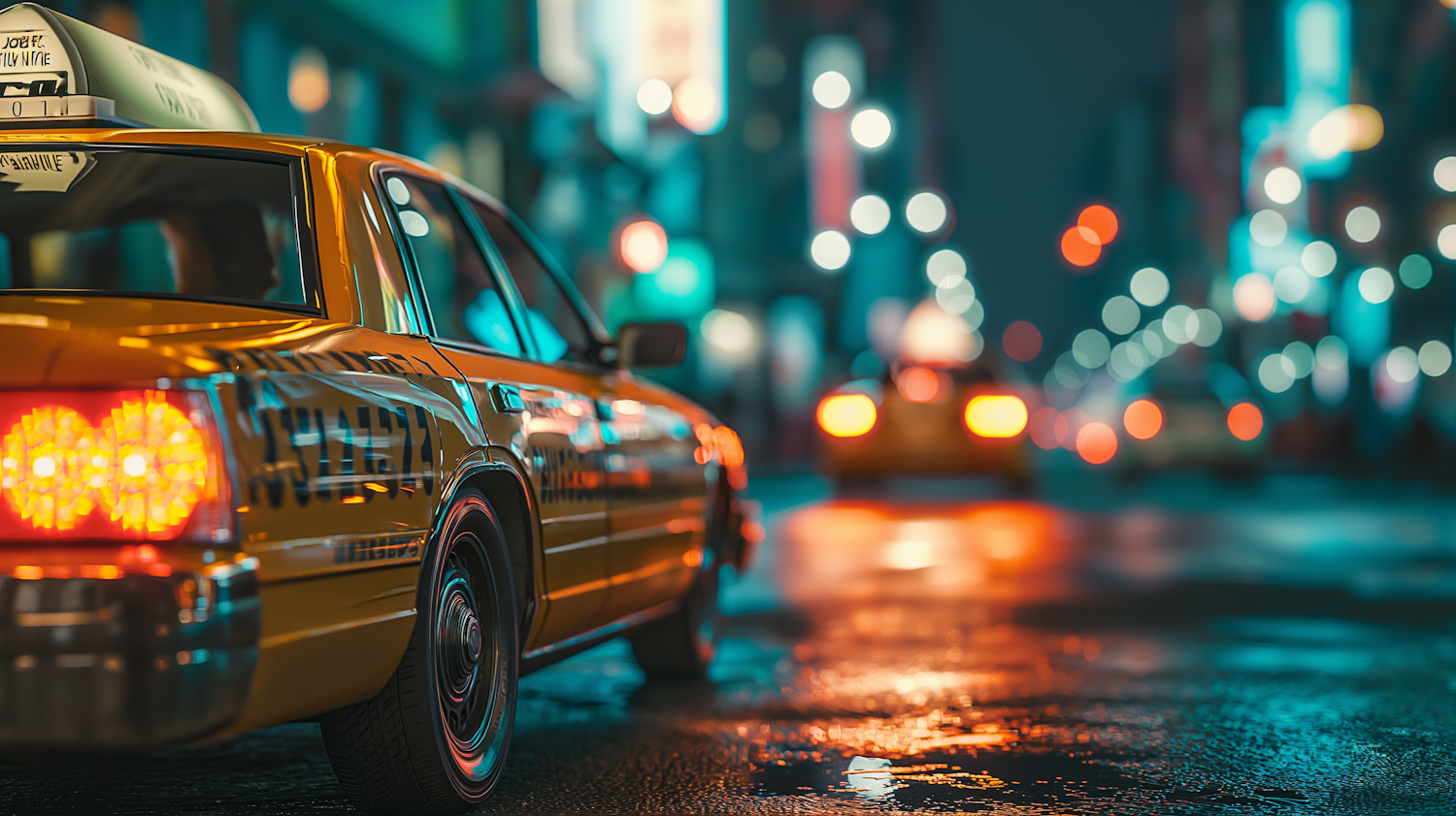 Yellow taxi in a vibrant city night scene with glowing lights and wet pavement reflections, creating a cinematic urban atmosphere.