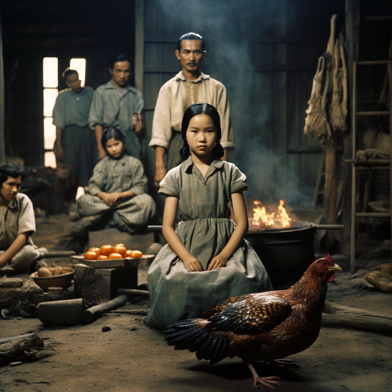 A young girl sits in a rustic setting with a chicken, surrounded by family. The scene is somber and traditional, with muted colors.