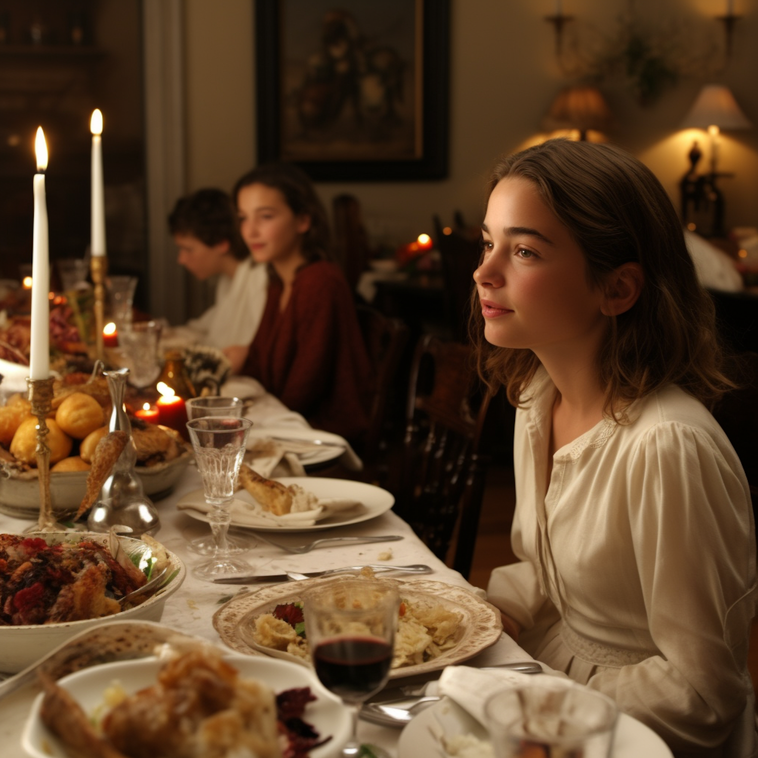 A cozy family dinner scene with a young girl in focus, surrounded by festive dishes and warm candlelight.