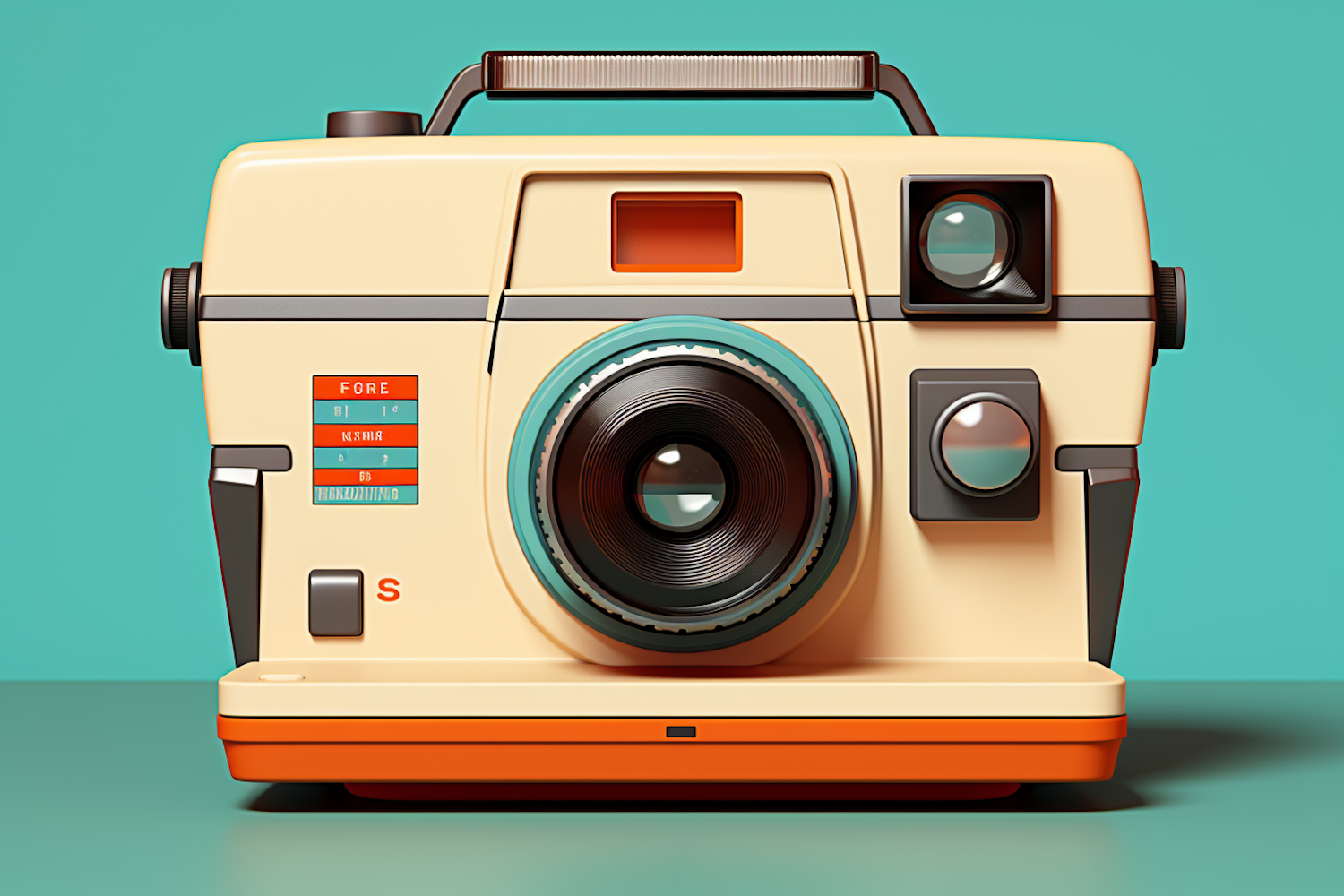 Retro-style cream and orange camera with teal accents against a teal background, featuring a large central lens.