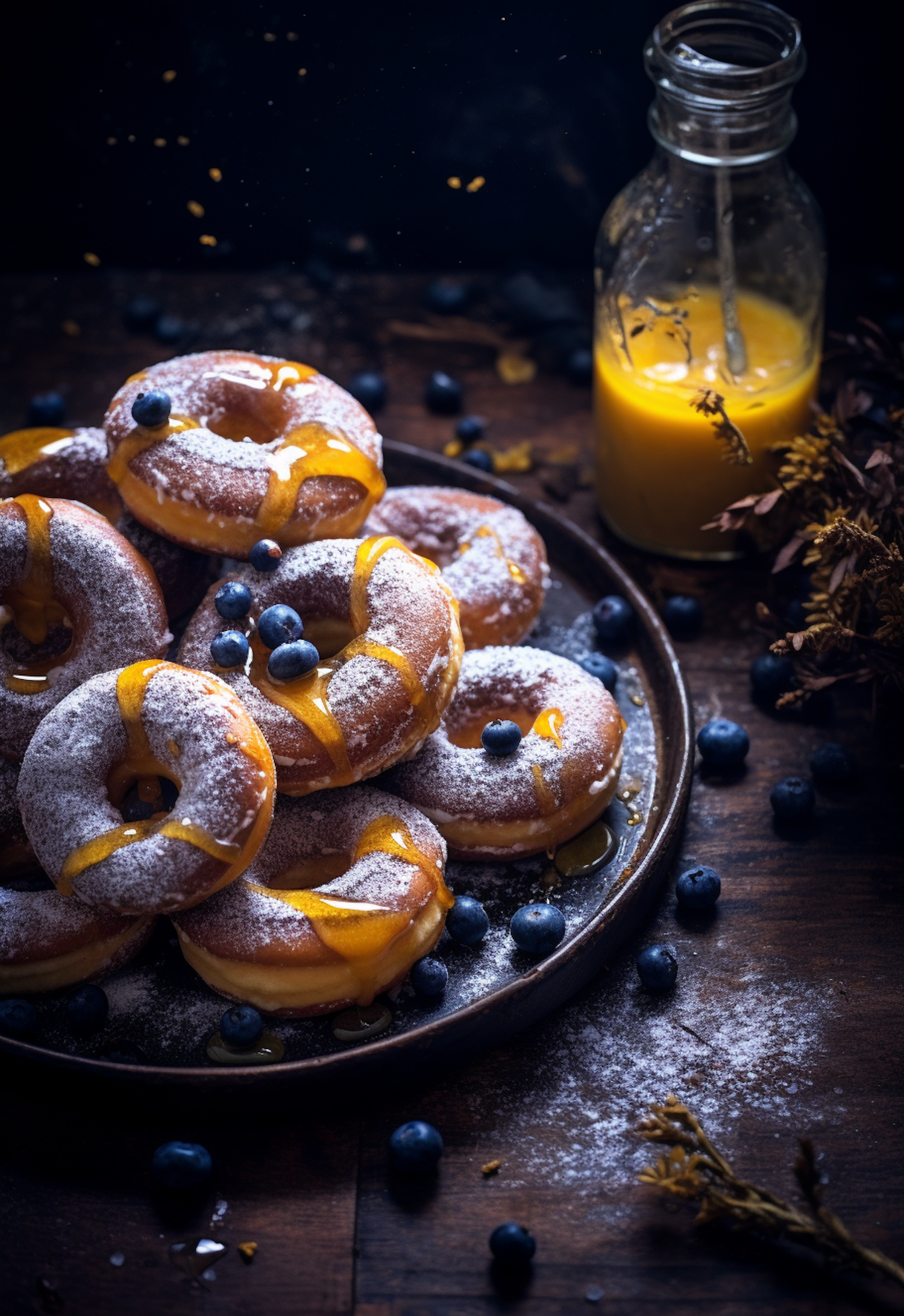 Delicious donuts with powdered sugar and syrup, surrounded by fresh blueberries, on a rustic table with a bottle of orange juice.