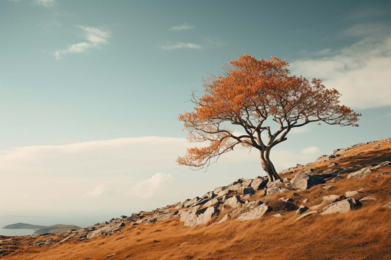 Solitary tree with orange leaves on a rocky hillside under a clear blue sky, evoking a serene autumn landscape.