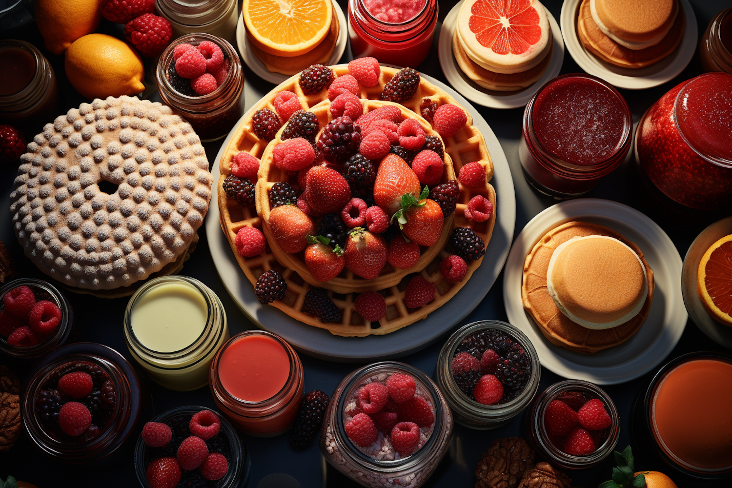 Colorful breakfast spread with waffles, fresh berries, jams, and citrus fruits. A delightful mix of textures and vibrant colors.