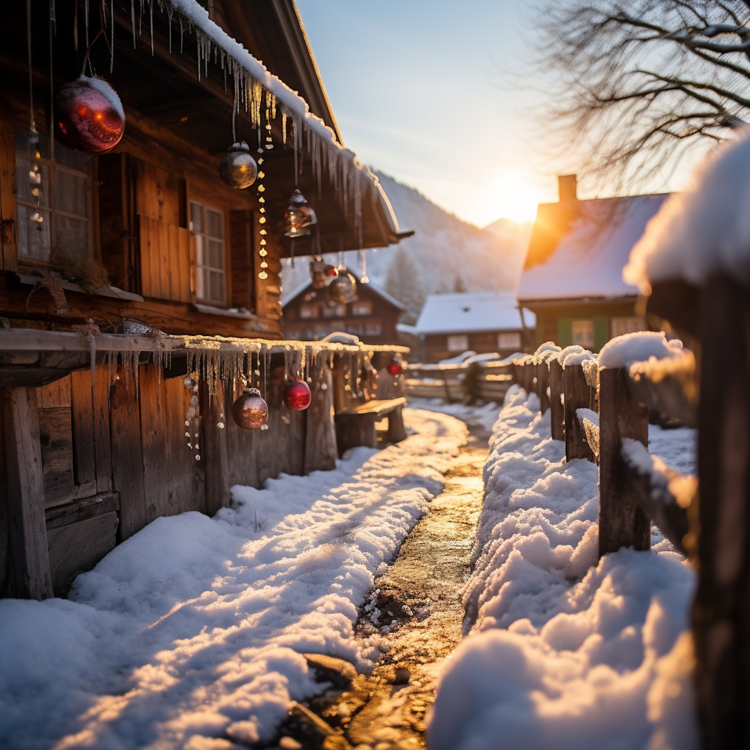 Charming winter cabin with festive decorations, snow-covered path, and golden sunset glow, creating a serene and cozy atmosphere.