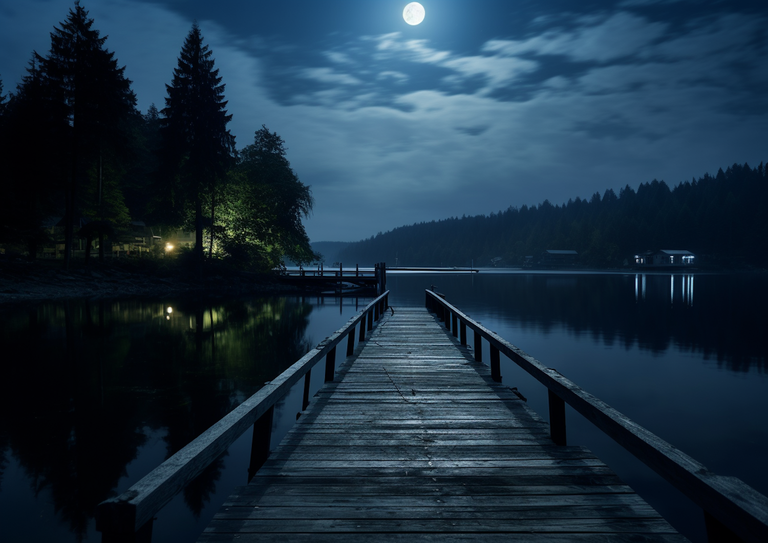 Moonlit pier over a tranquil lake with reflections, surrounded by trees and a cozy house, under a cloudy night sky.