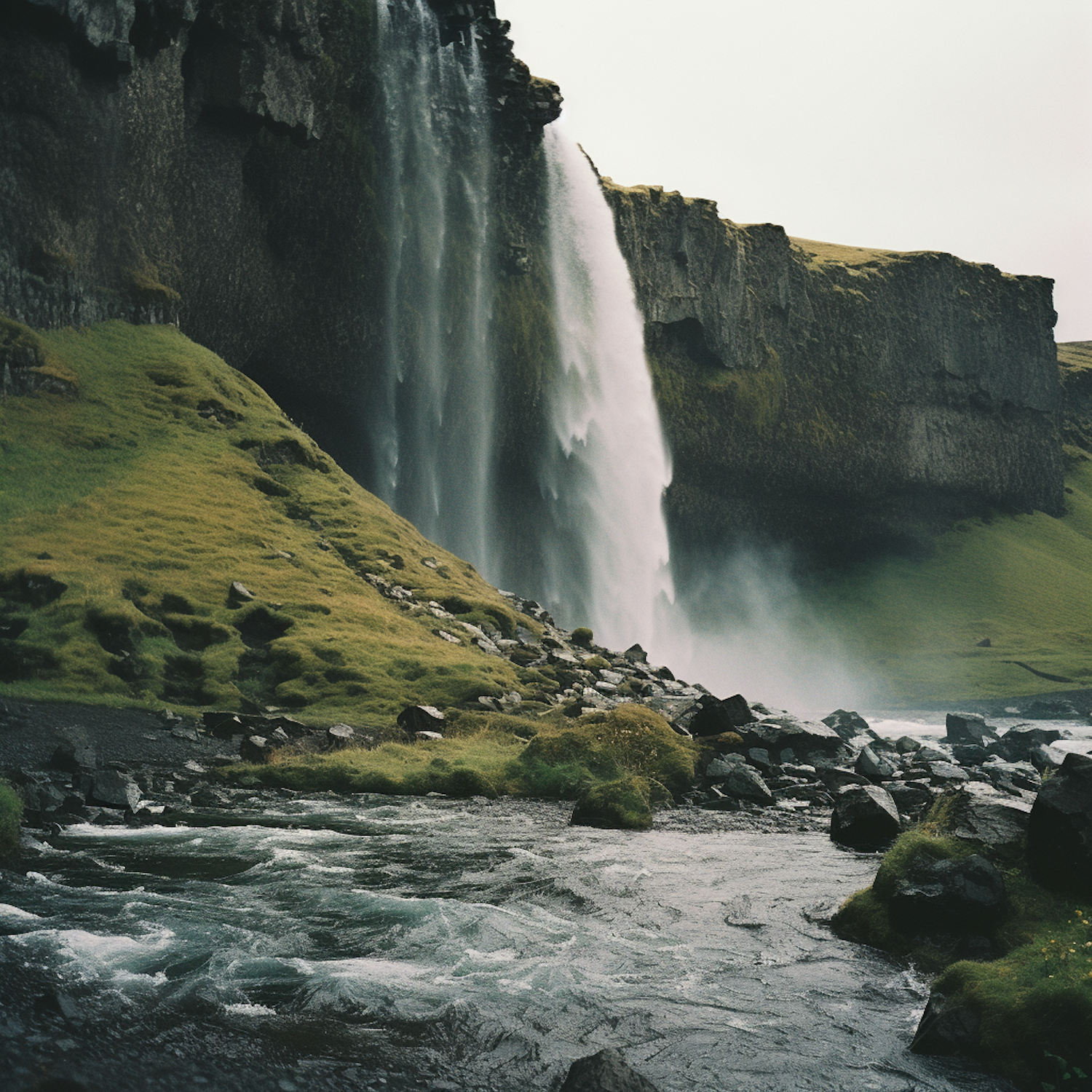 Majestic waterfall cascading down a rugged cliff with lush greenery and a winding river below, under an overcast sky.