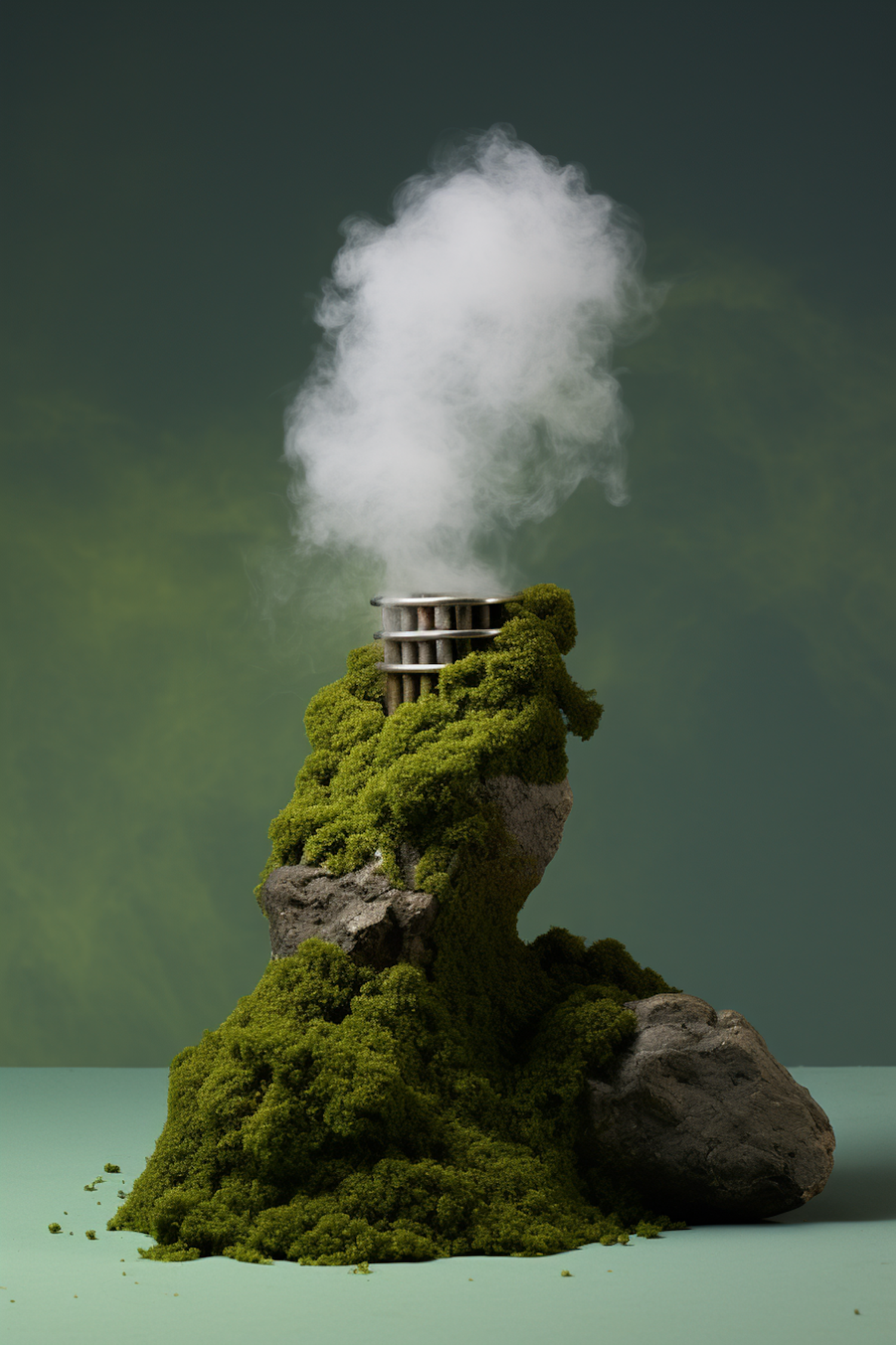 A metal chimney emits smoke atop a moss-covered rock, set against a dark green background, blending industrial and natural elements.