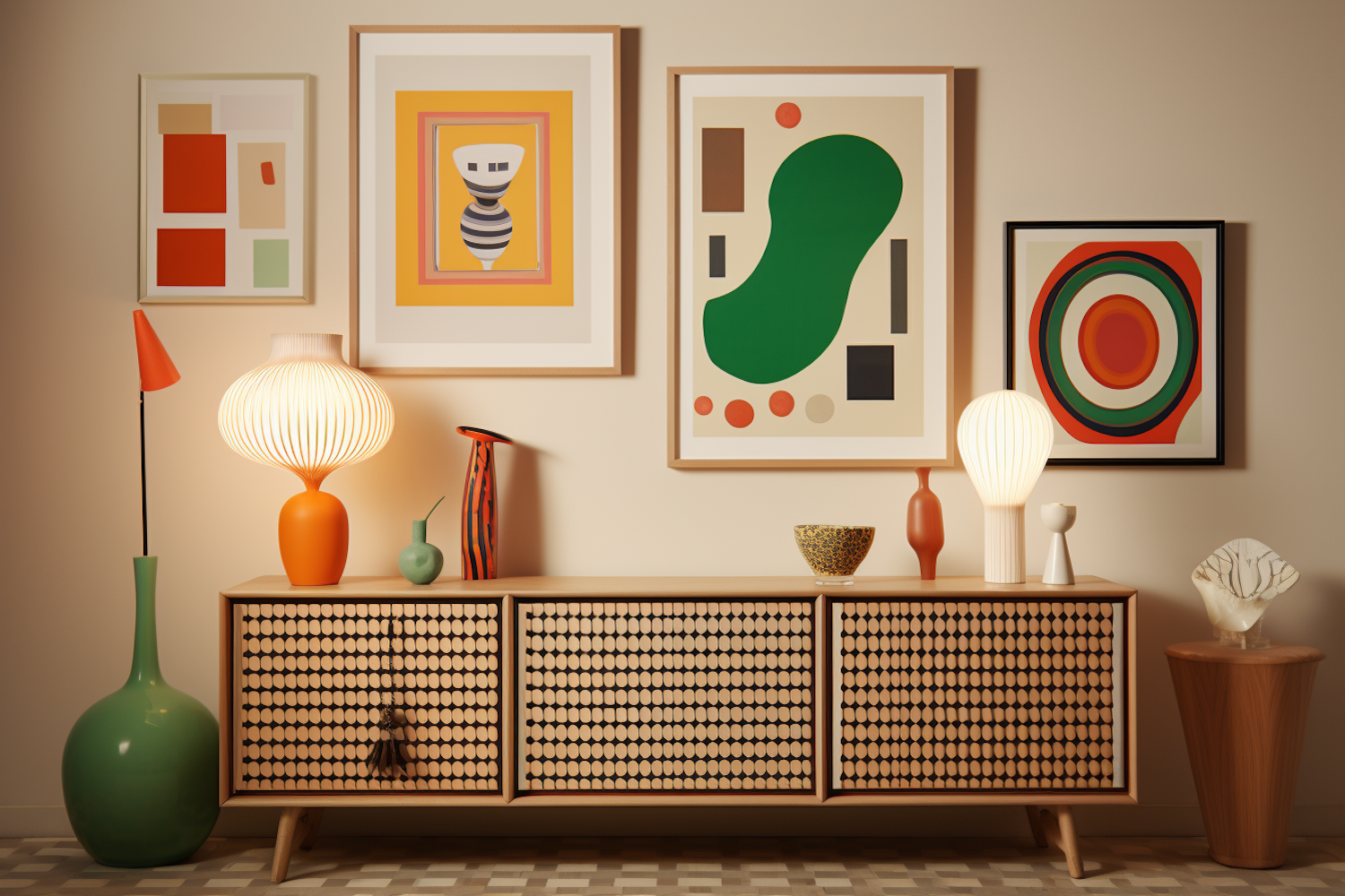 Mid-century modern interior with abstract art, vibrant decor, and a stylish wooden sideboard. Warm, inviting atmosphere.
