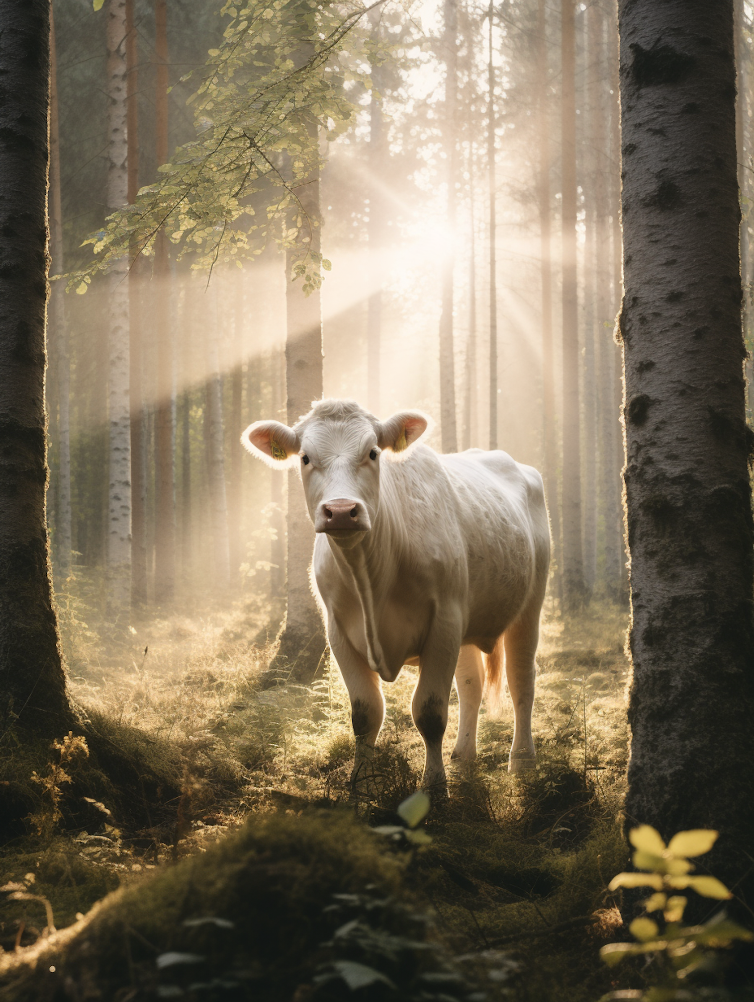 A white cow stands in a sunlit forest, surrounded by tall trees and lush greenery, with sunbeams creating a serene atmosphere.