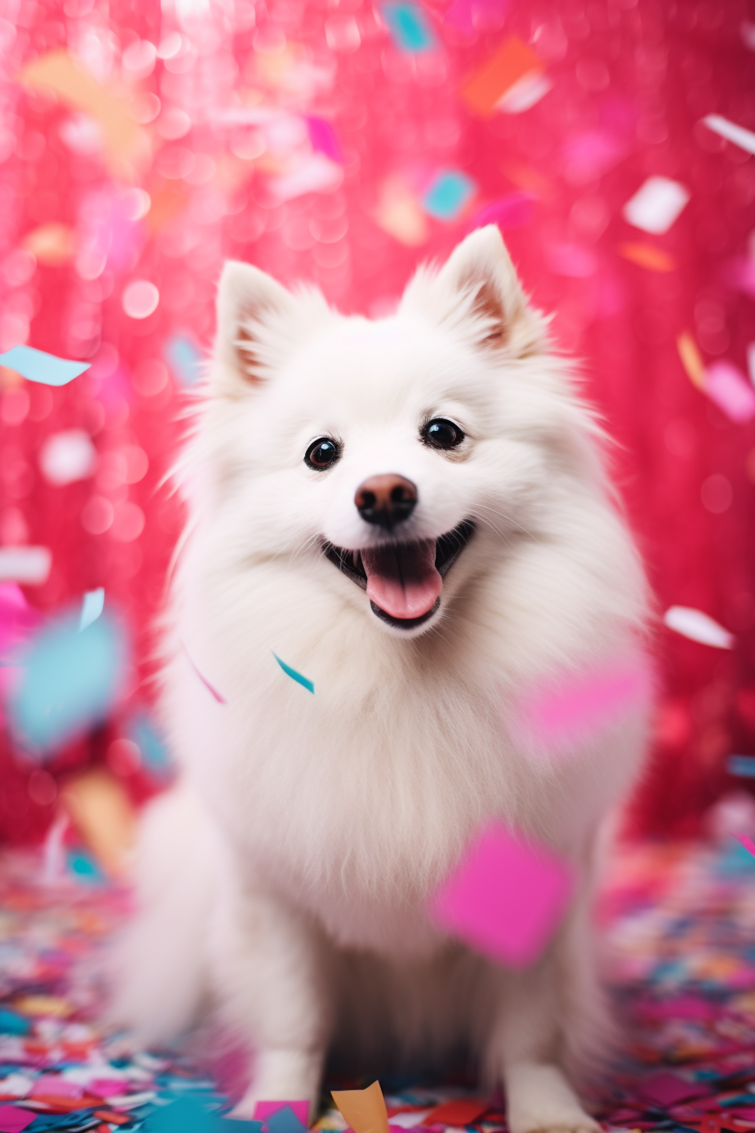 Fluffy white dog surrounded by colorful confetti on a vibrant pink background, exuding joy and playfulness.