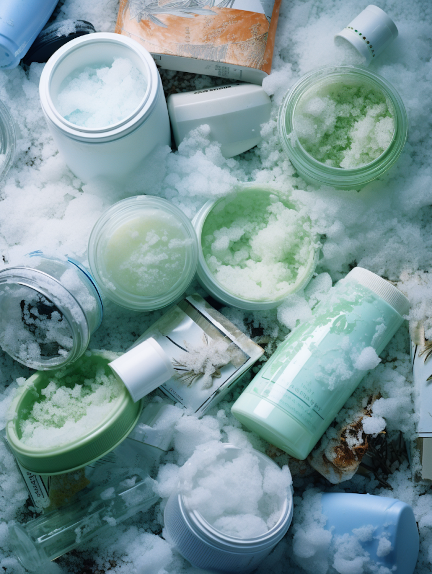 Skincare products in pastel containers scattered on snow, showcasing creams and scrubs in a wintry setting.