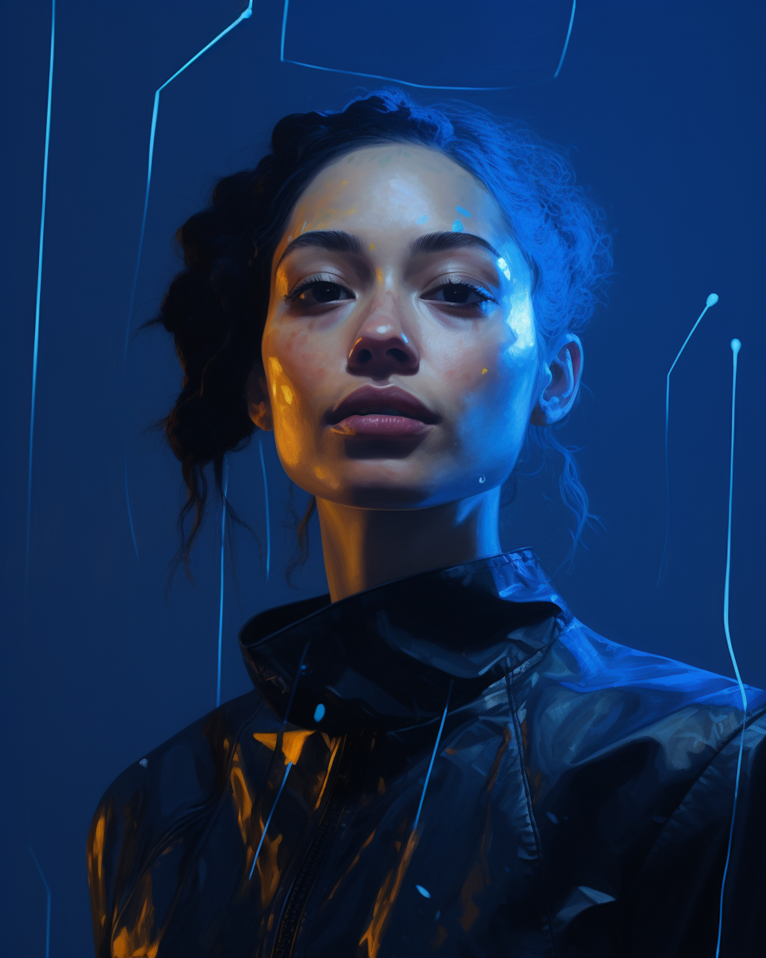 Futuristic portrait of a woman in a shiny black jacket with blue and orange lighting, set against a digital-themed background.