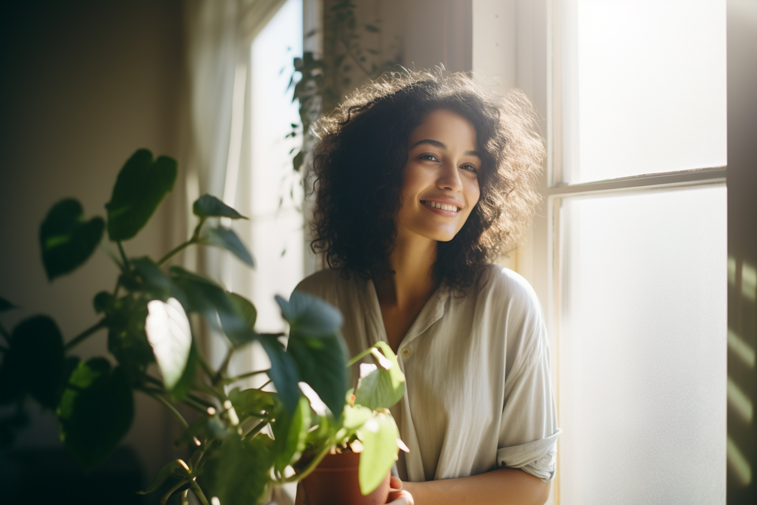 Smiling woman with curly hair holding a potted plant by a sunlit window, surrounded by vibrant greenery in a cozy indoor setting.