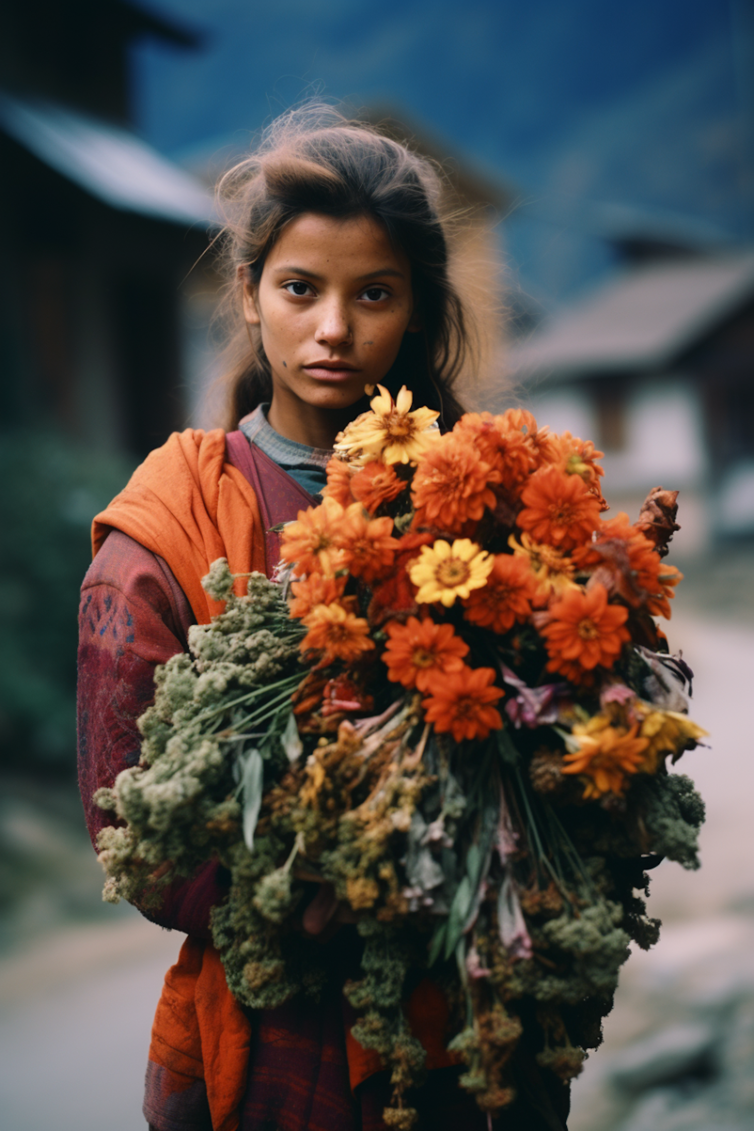 Young woman with dark hair holds vibrant orange and yellow flowers, wearing a red shawl. Serene expression, rural blurred background.