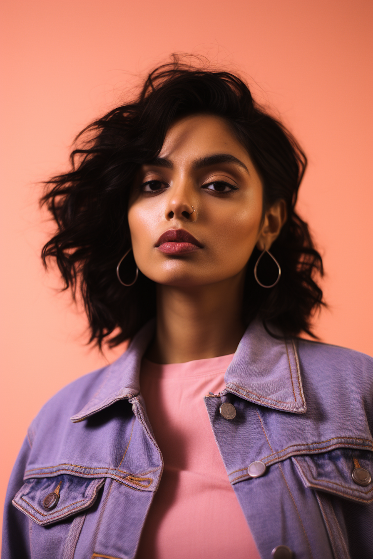 Stylish woman with wavy hair, hoop earrings, and pastel outfit against a peach background. Confident expression and modern fashion vibe.
