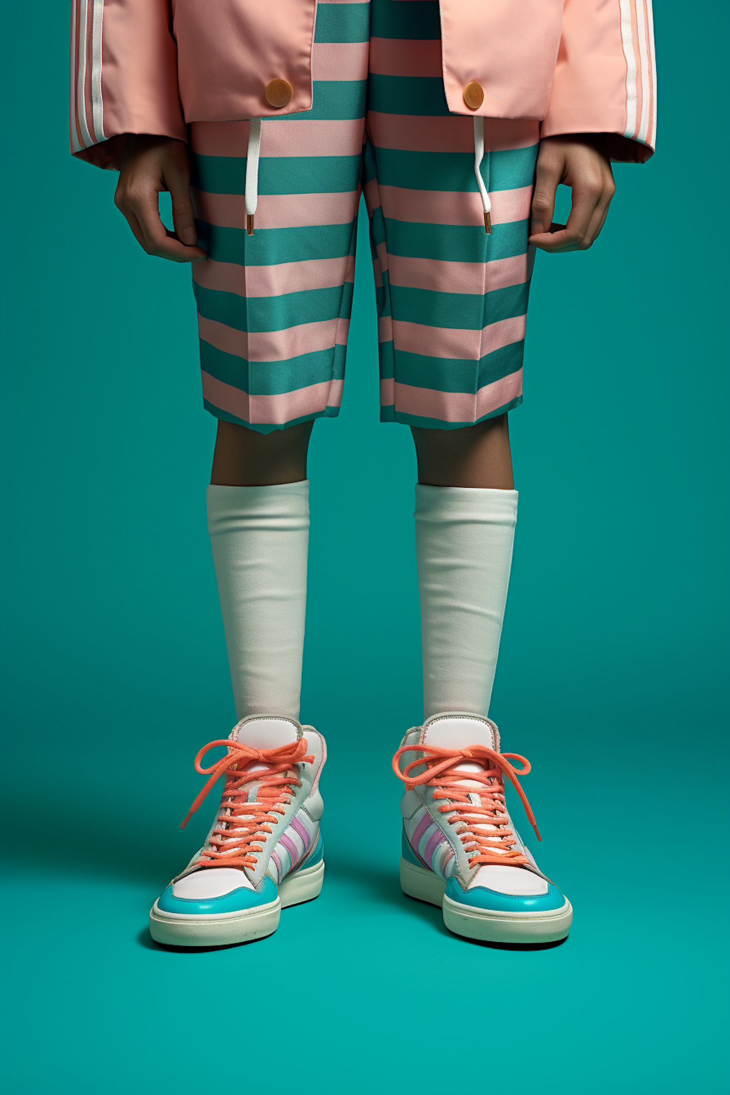 Playful outfit with pink jacket, striped shorts, white socks, and colorful sneakers with orange laces on a teal background.