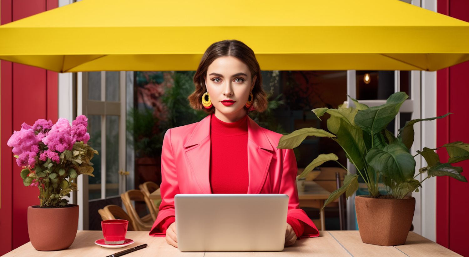 Woman in red and pink outfit working on a laptop, surrounded by plants and vibrant colors, under a yellow umbrella.