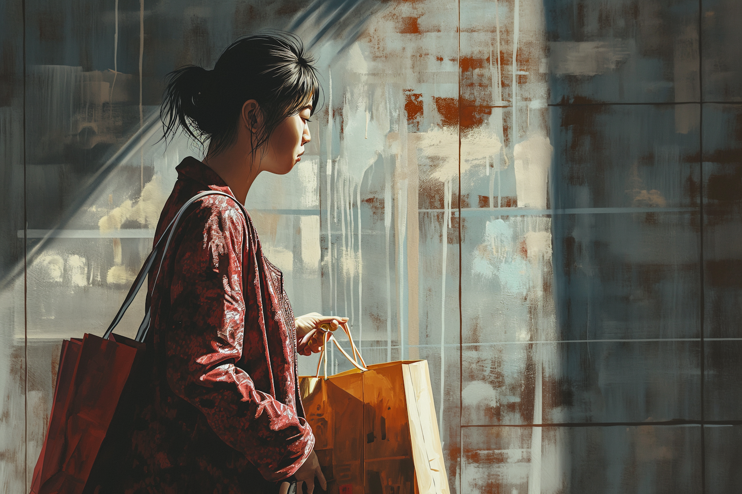 Asian woman in red jacket carrying shopping bags, set against an abstract, colorful background with soft lighting and shadows.