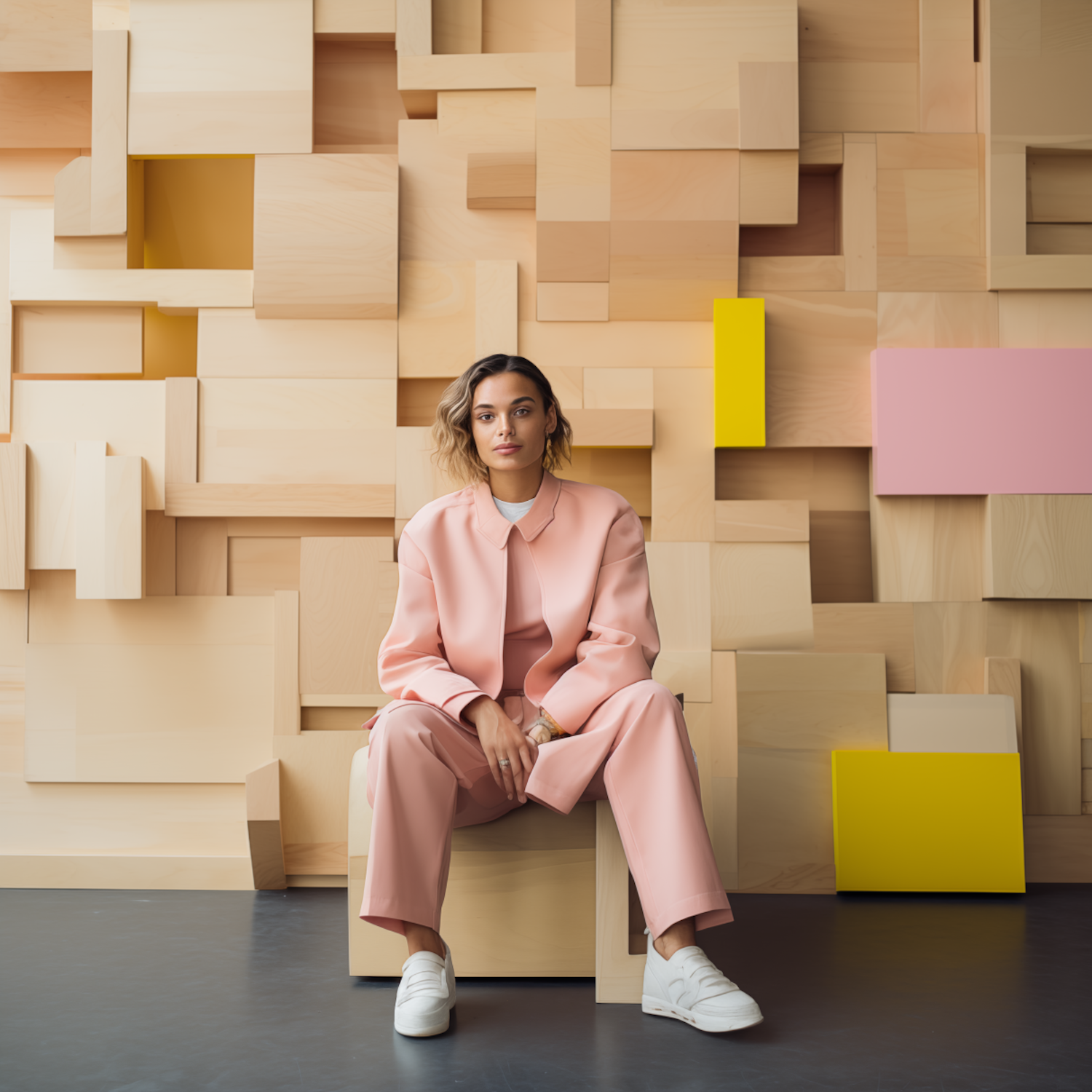 Stylish woman in pastel pink suit sits against a geometric wooden backdrop with yellow and pink accents, exuding modern elegance.