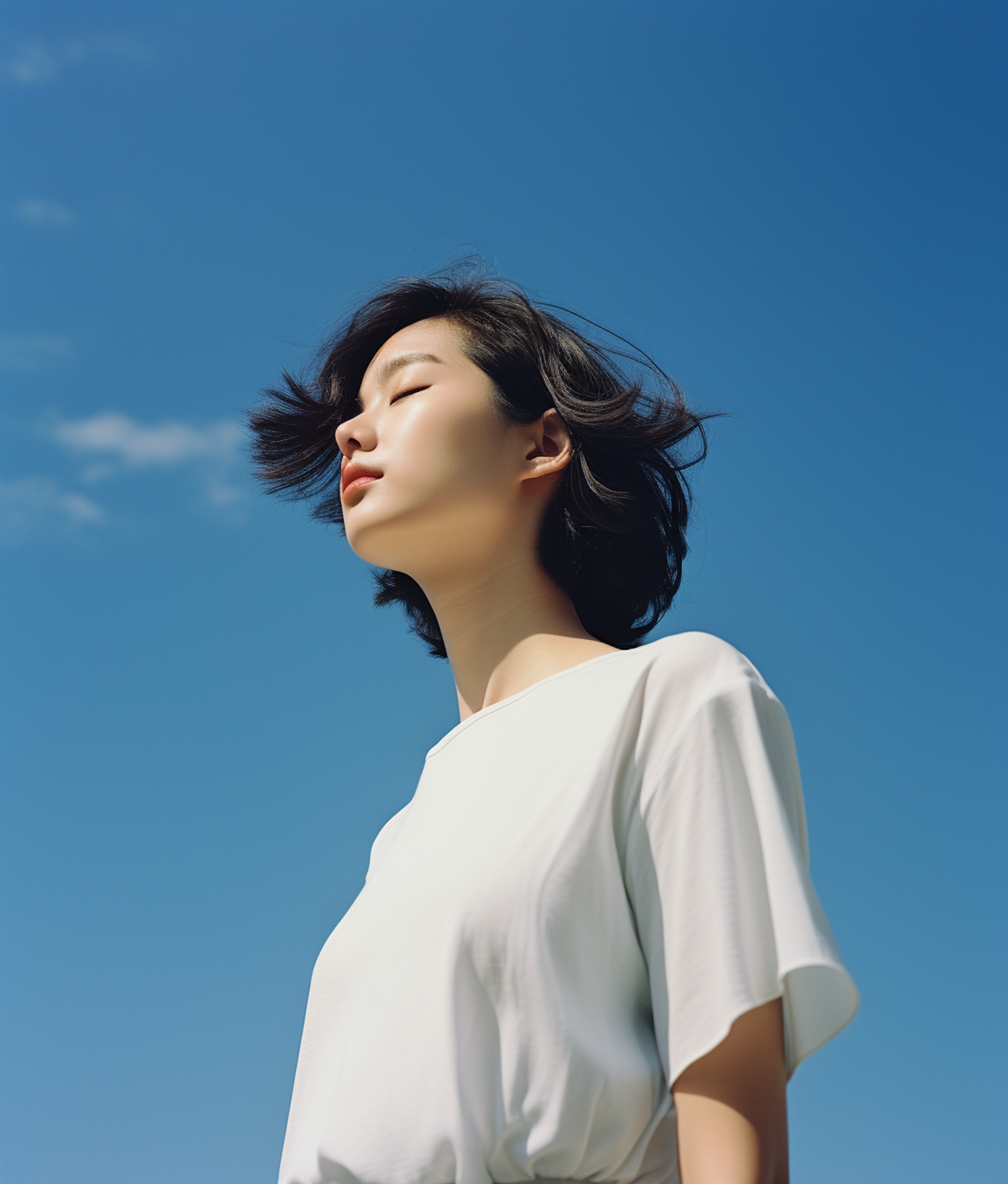Serene Asian woman with short black hair enjoys the sun against a clear blue sky, wearing a white shirt. Peaceful and minimalistic scene.