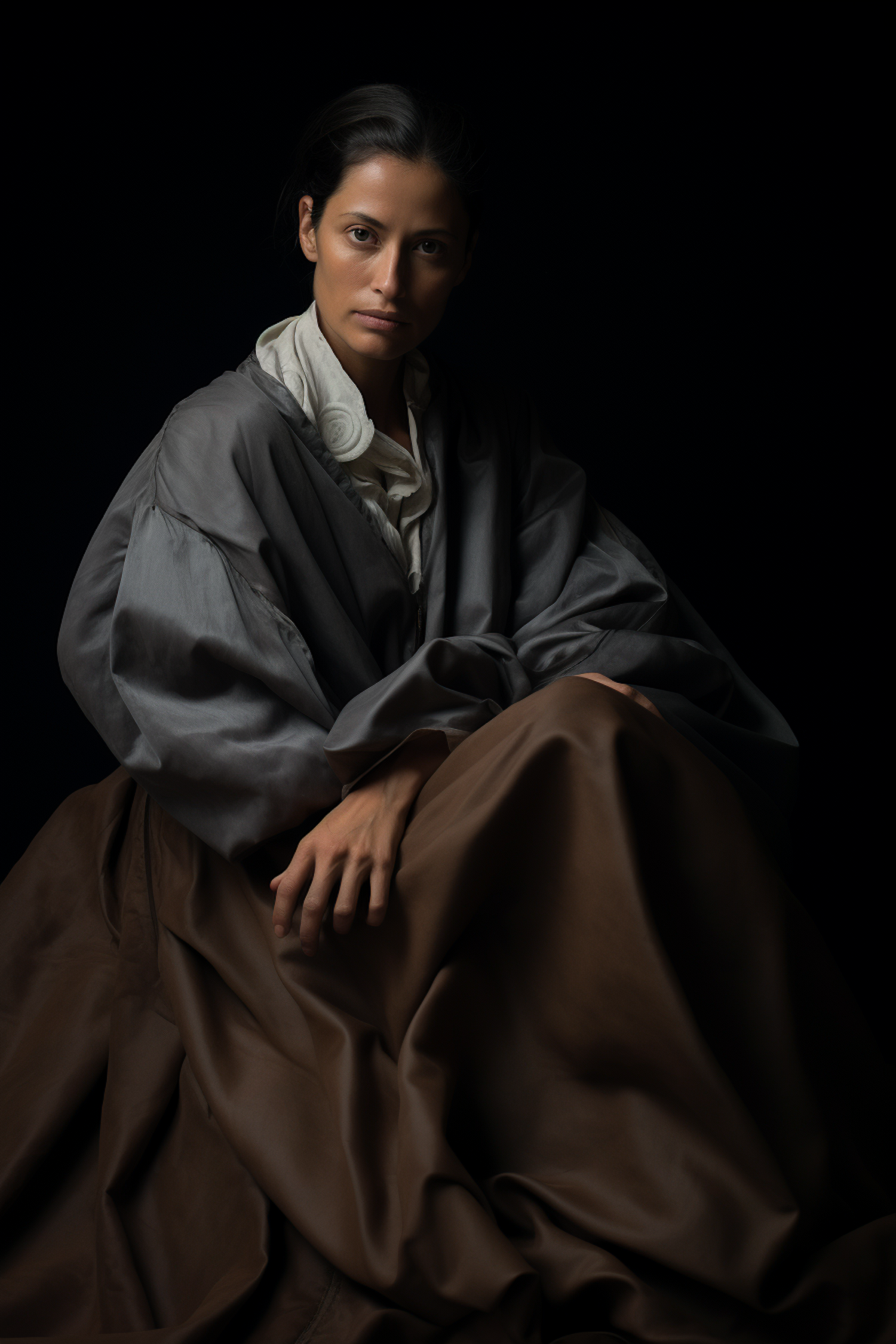 Portrait of a woman in muted tones, wearing a draped garment, with a calm expression against a dark background.