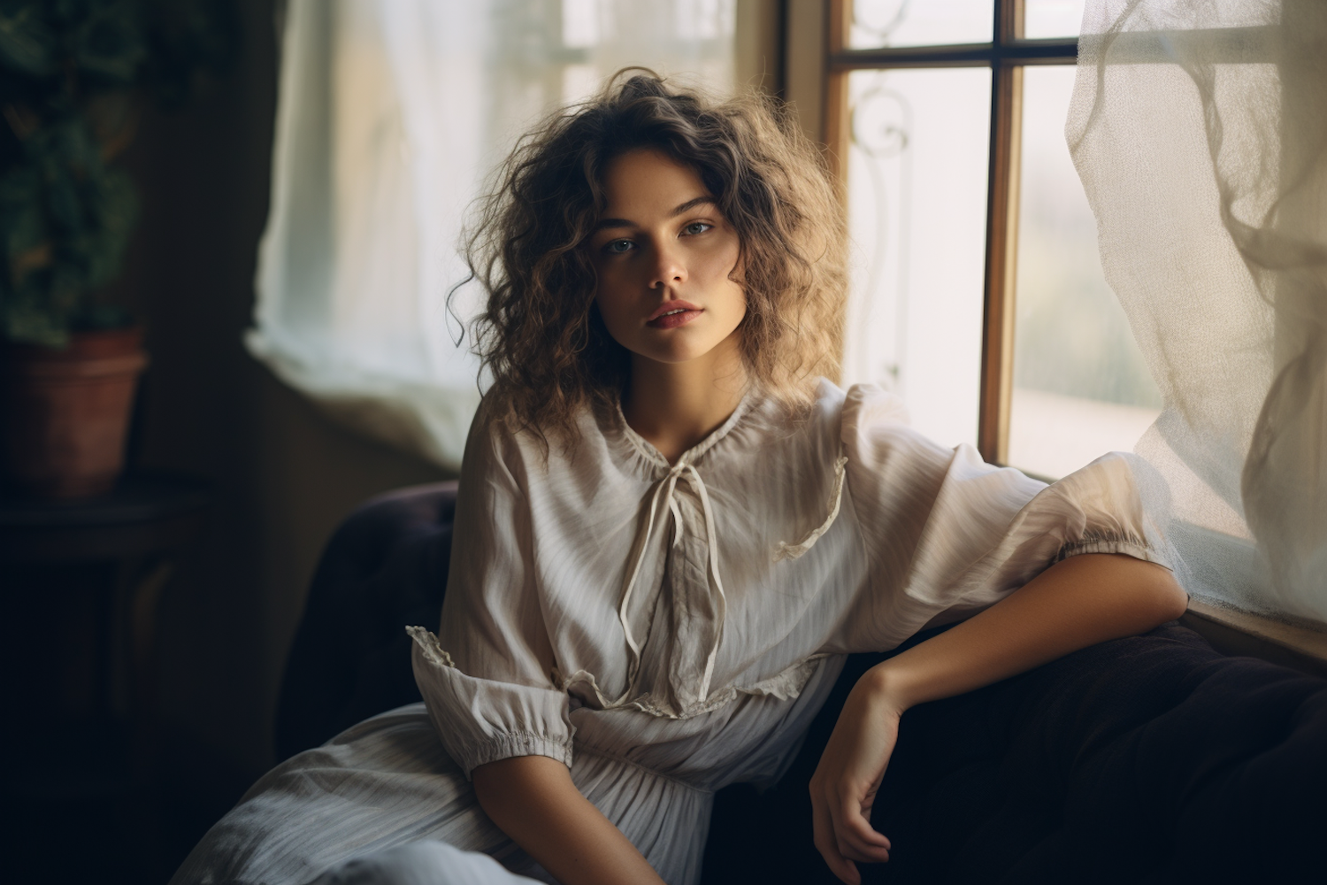 Young woman with curly hair in a white blouse sits by a window, bathed in soft natural light, creating a serene and intimate atmosphere.