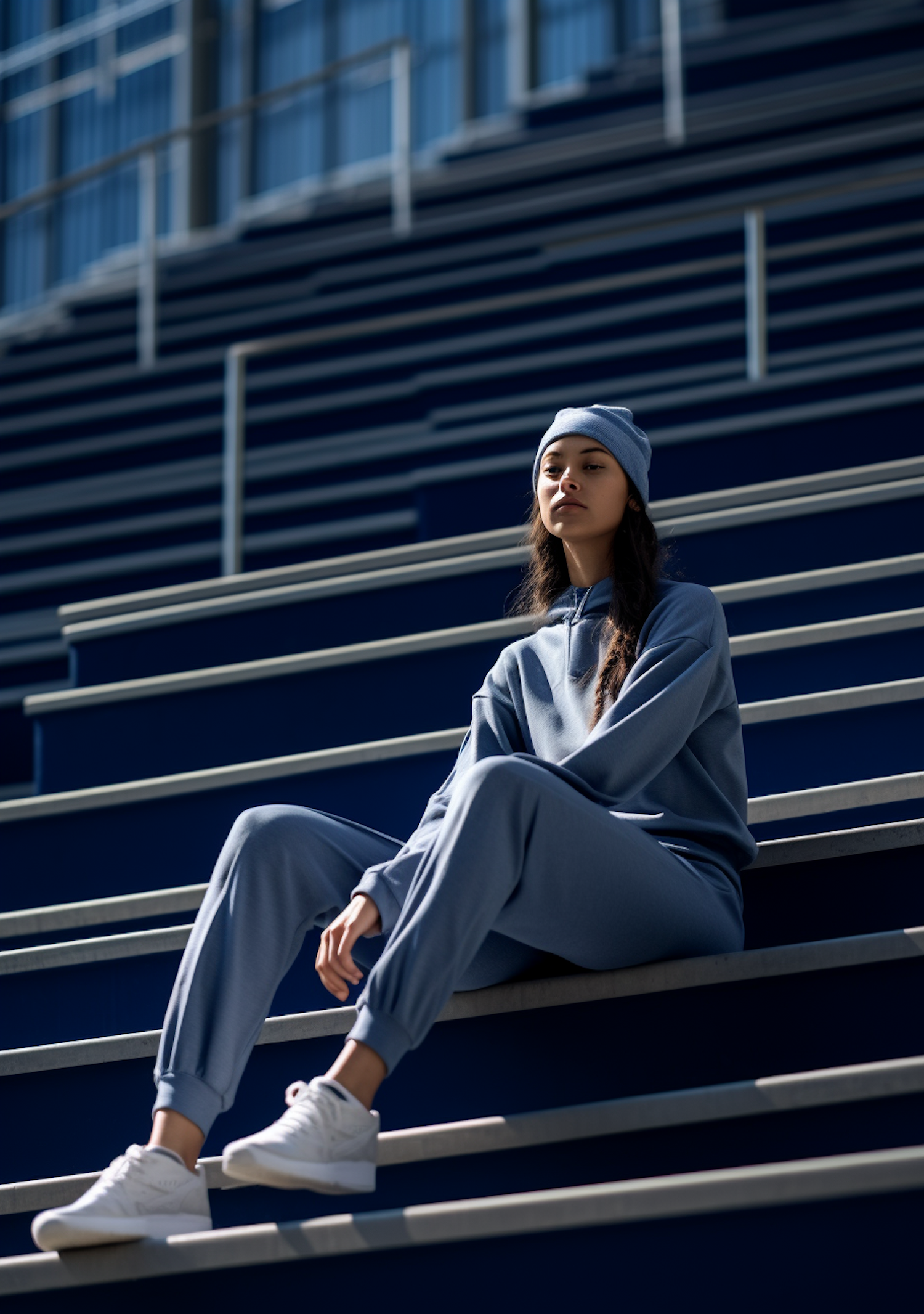 Person in blue tracksuit and white sneakers sits on blue stadium steps, face blurred, conveying a relaxed, casual vibe.