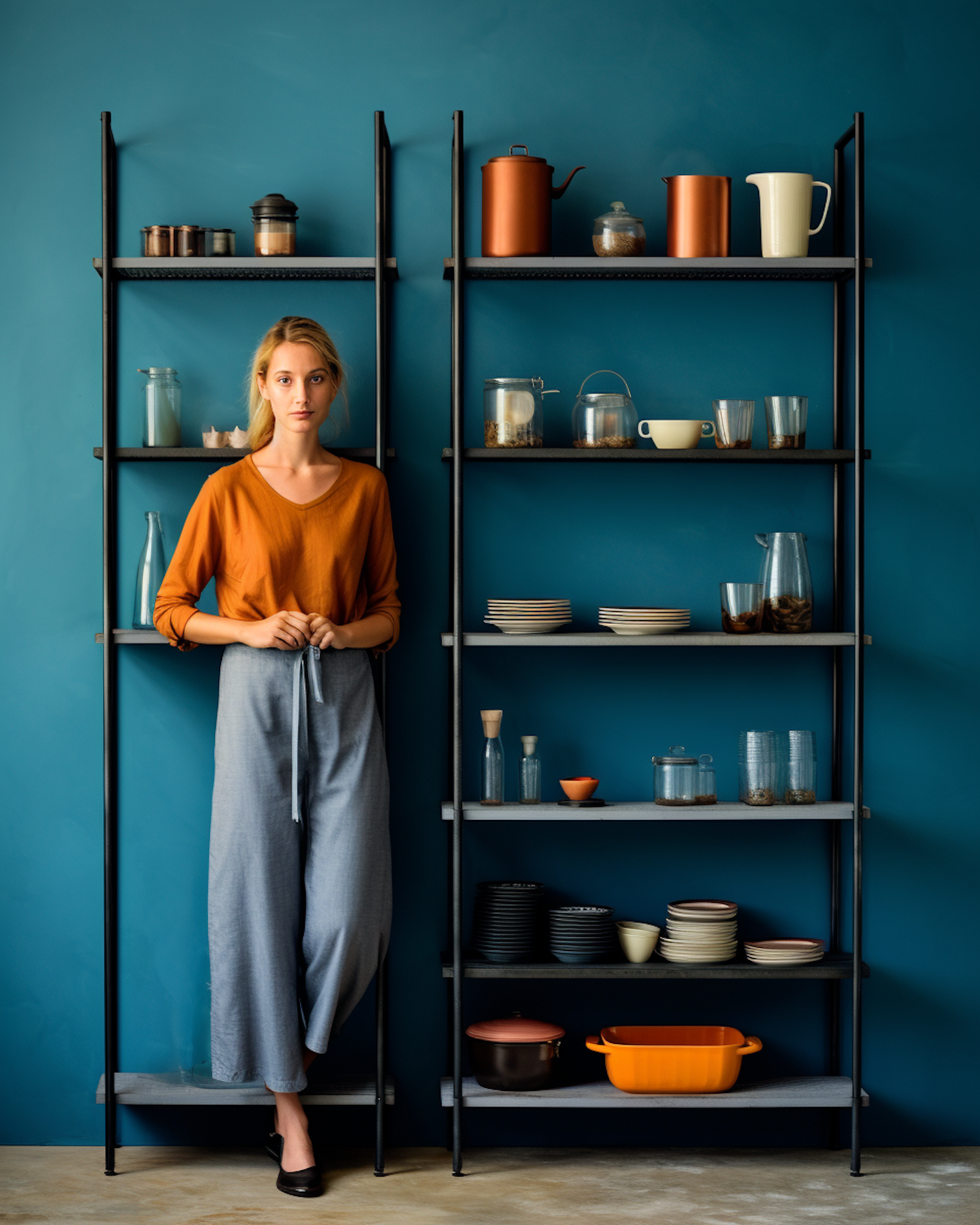 Woman in orange top stands by teal wall with kitchen shelves, featuring jars, dishes, and pots. Stylish and modern kitchen decor.