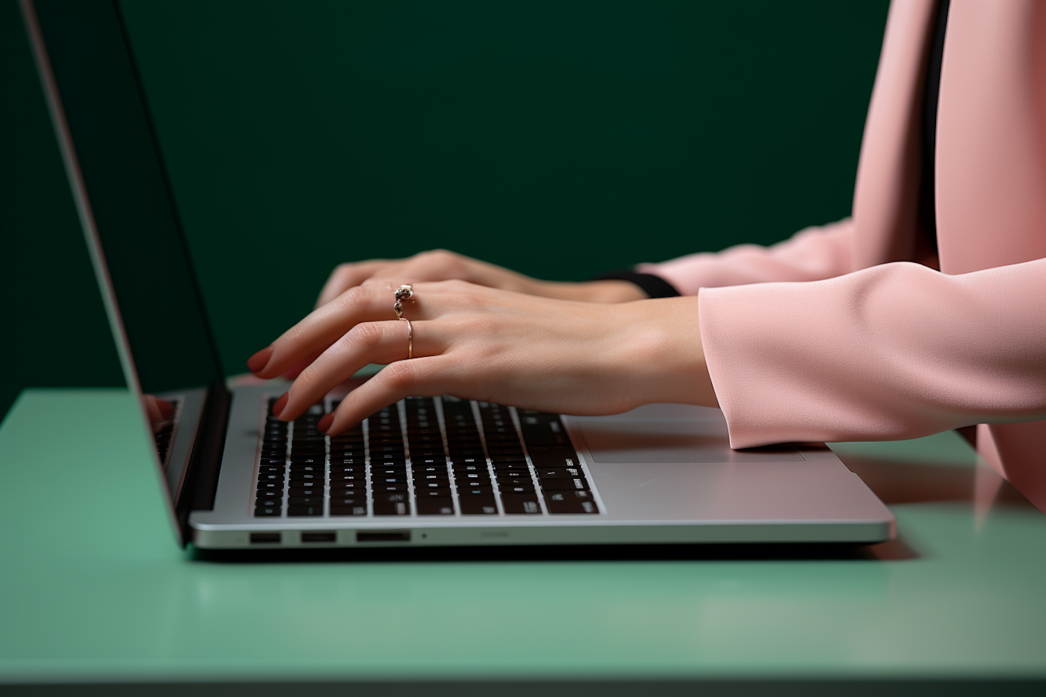 Close-up of hands typing on a laptop, wearing a pink blazer and ring, against a green background. Elegant and professional setting.