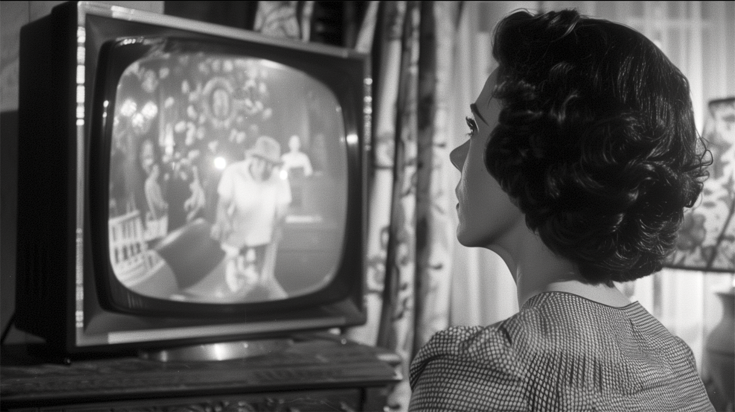 Vintage black and white scene of a woman watching an old TV, capturing a nostalgic mid-20th-century atmosphere.