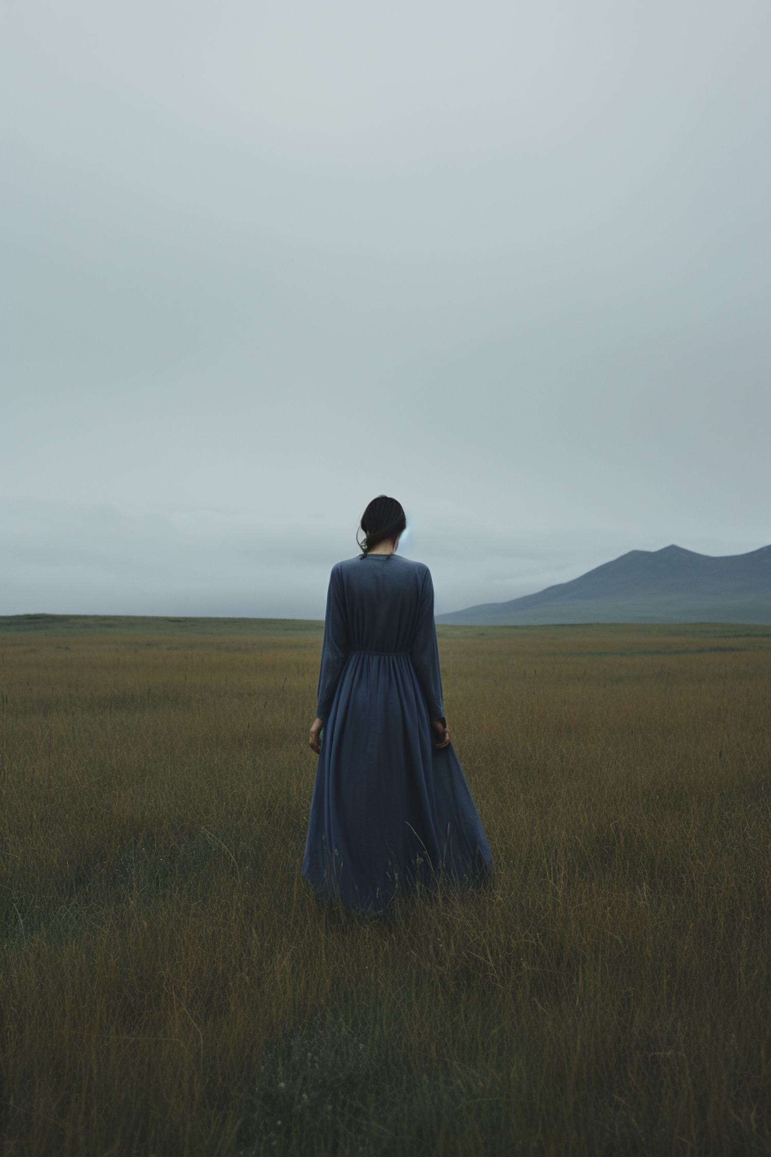 A solitary figure in a blue dress stands in a vast field under an overcast sky, evoking a sense of tranquility and introspection.