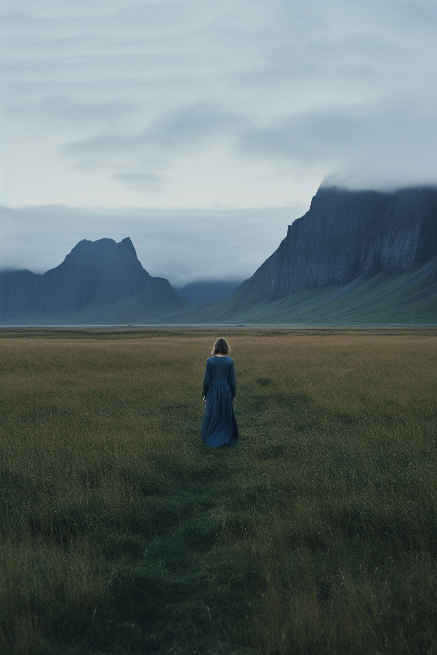 A woman in a blue dress stands in a vast field, gazing at misty mountains under an overcast sky, creating a serene and contemplative scene.