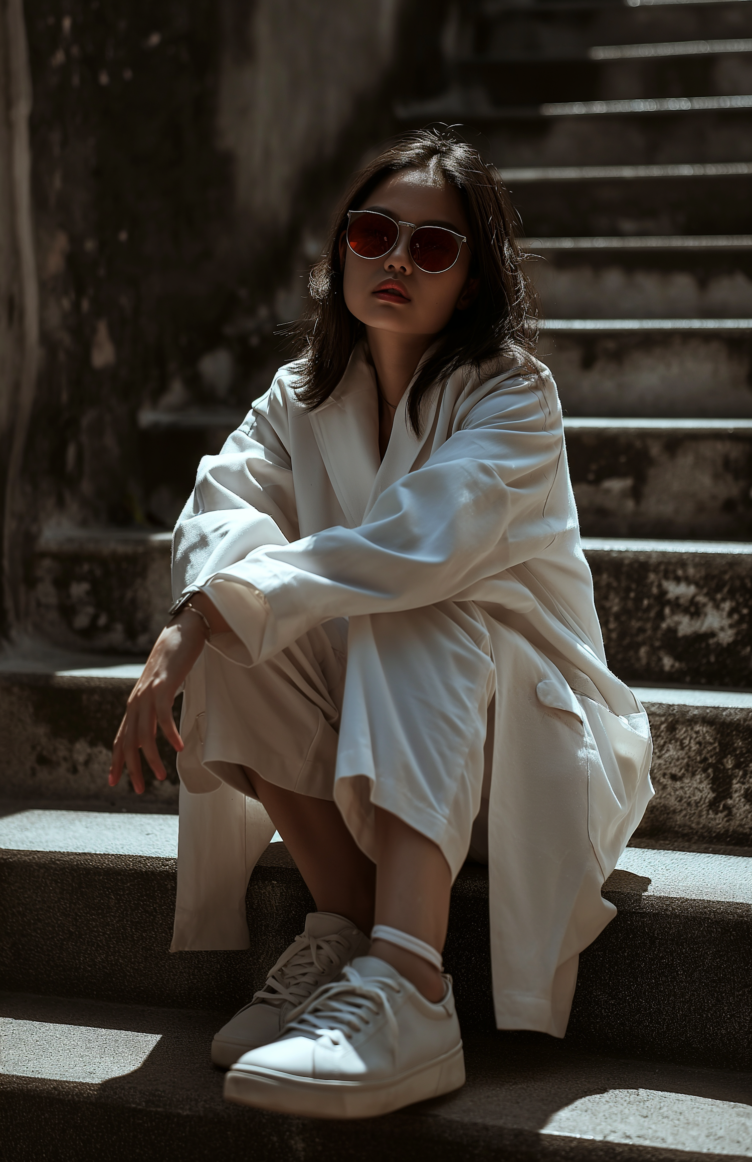 Stylish woman in white outfit and sunglasses sitting on stairs, dramatic lighting highlights her calm expression.