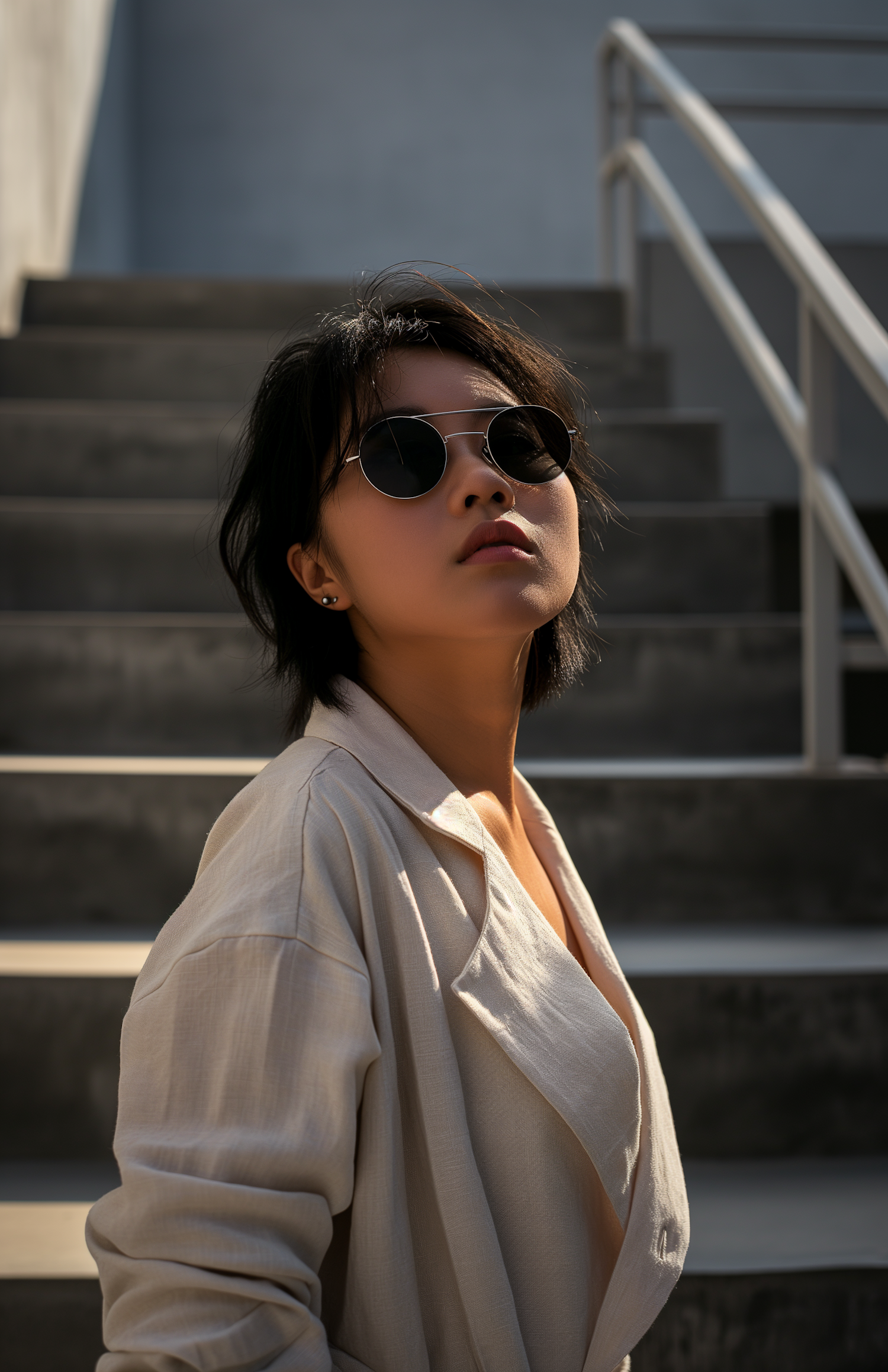 Stylish Asian woman in sunglasses poses on urban stairs, wearing a beige coat. Sunlight highlights her confident expression.